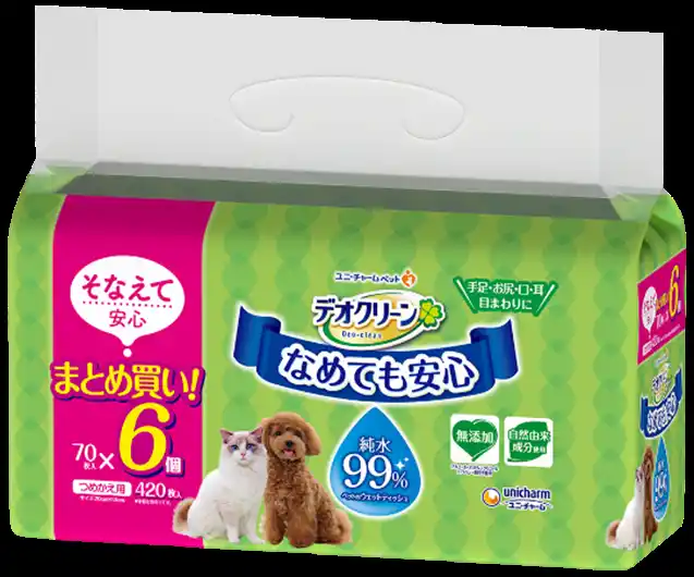 避難生活では水の使用が限られることもあります。周囲への配慮を忘れずに過ごすためにも、ペットの清潔を保つ工夫が大切です。デオクリーンは、排泄後のおしりまわりや手足の汚れ、食事後の口まわりのケアなど、さまざまな場面で活躍するペット用ウェットティッシュです。 |