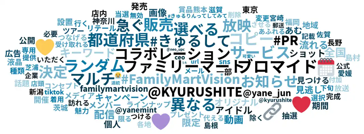 コラボキャンペーン期間中、SNS上では「#きゅるりんってしてみて」「#FamilyMartVision」のハッシュタグ付き投稿が多数確認され、ファンによるファミリーマート店舗への訪問の様子や動画視聴の感想が活発に共有されるなど、Xを中心に3,300件以上※の投稿がみられました。特に、都道府県別で異なるオリジナル動画の配信については「自分の住んでいる地域の動画は○○(曲名、メンバー)だった!」という発見や、全種類コンプリートするために色々な県のファン同士でキーワードを共有し合うなど、地域性を活かしたSNSならではの反響が得られました。また、「見に行かなきゃ!」「期間中はファミマ通います」など、店舗への来店の動機にもつながる投稿も多くみられました。 |