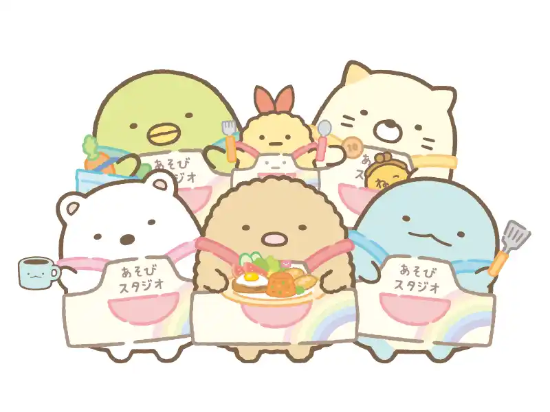 | さらに、あそびスタジオ限定てのりぬいぐるみに、新たに「えびふらいのしっぽ」が仲間入り。「えびふらいのしっぽ」はオリジナルアート同様、デザイン違いのエプロンを着用しています。施設内ではすみっコたちとおそろいのエプロンを着て、ごっこ遊びを楽しむことができます。 | ||||||||||||||||||
