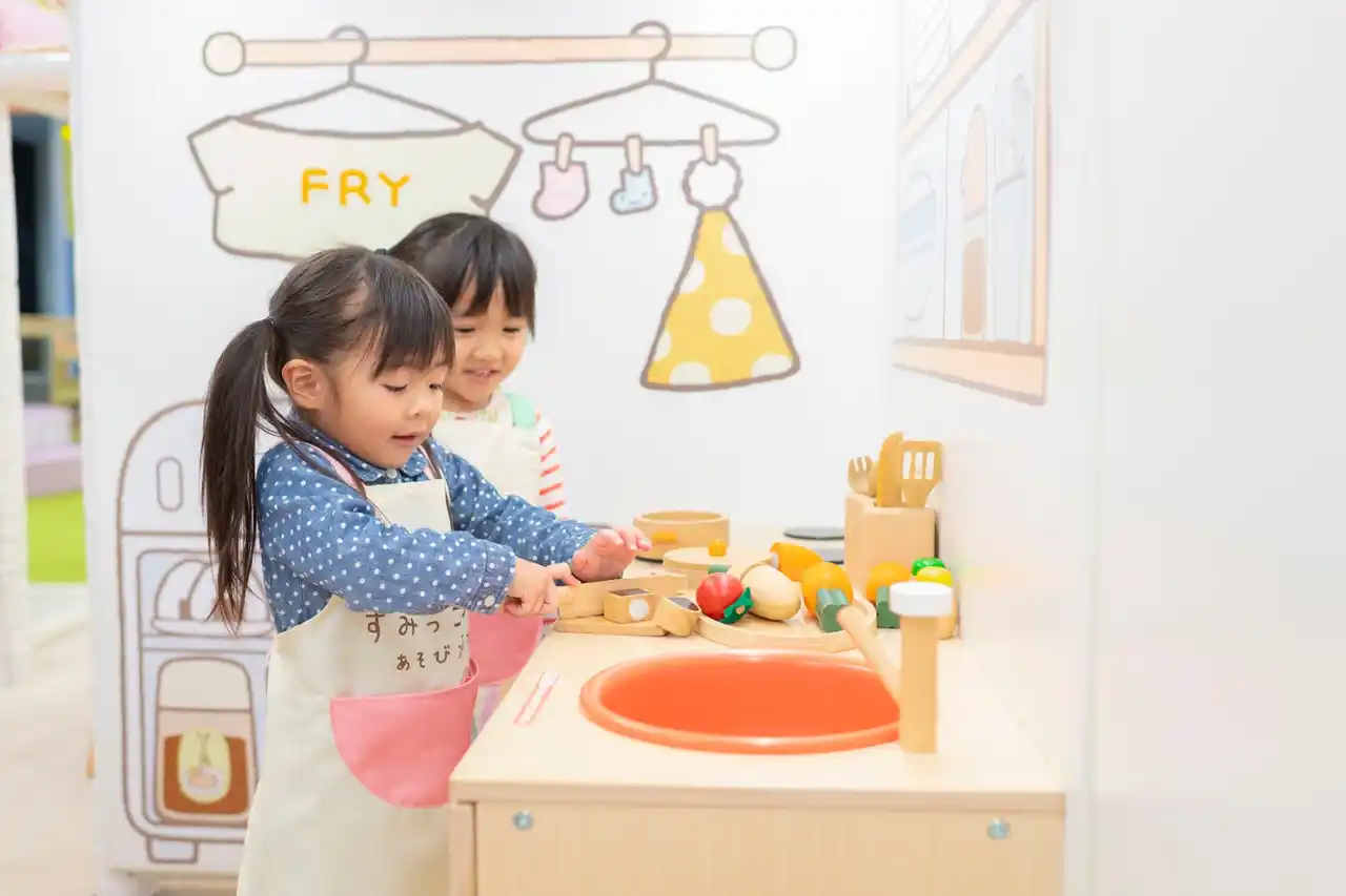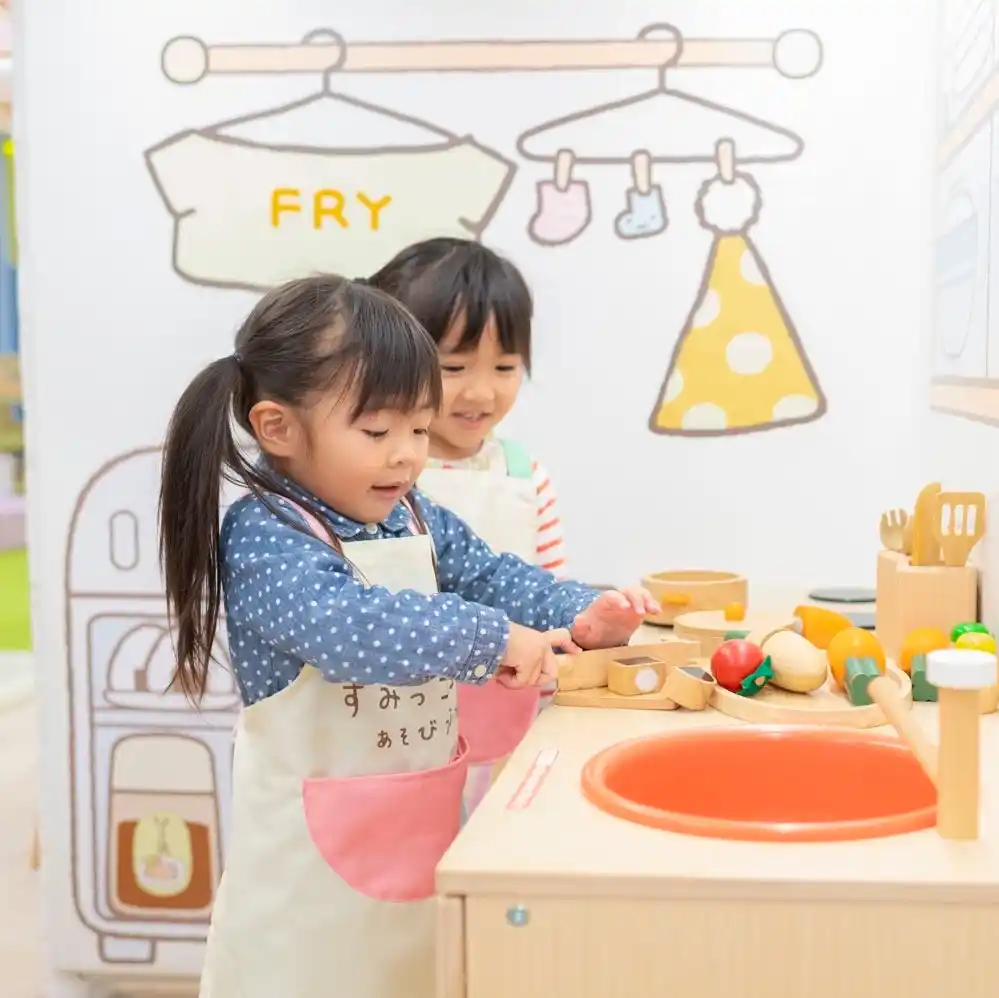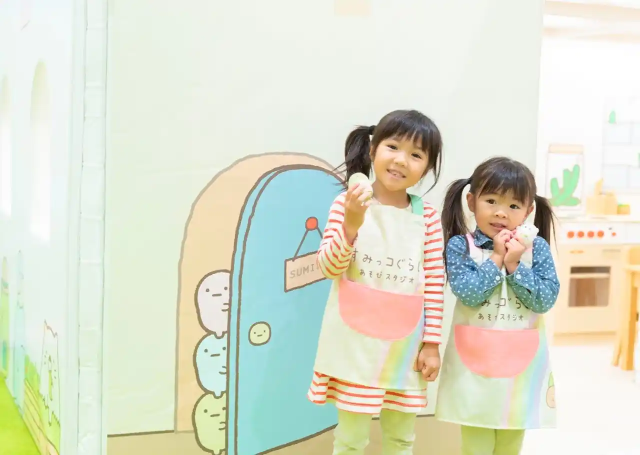 | 施設内ではすみっコたちとおそろいのエプロンを着て、ごっこ遊びを楽しめます! | ||||||||||
