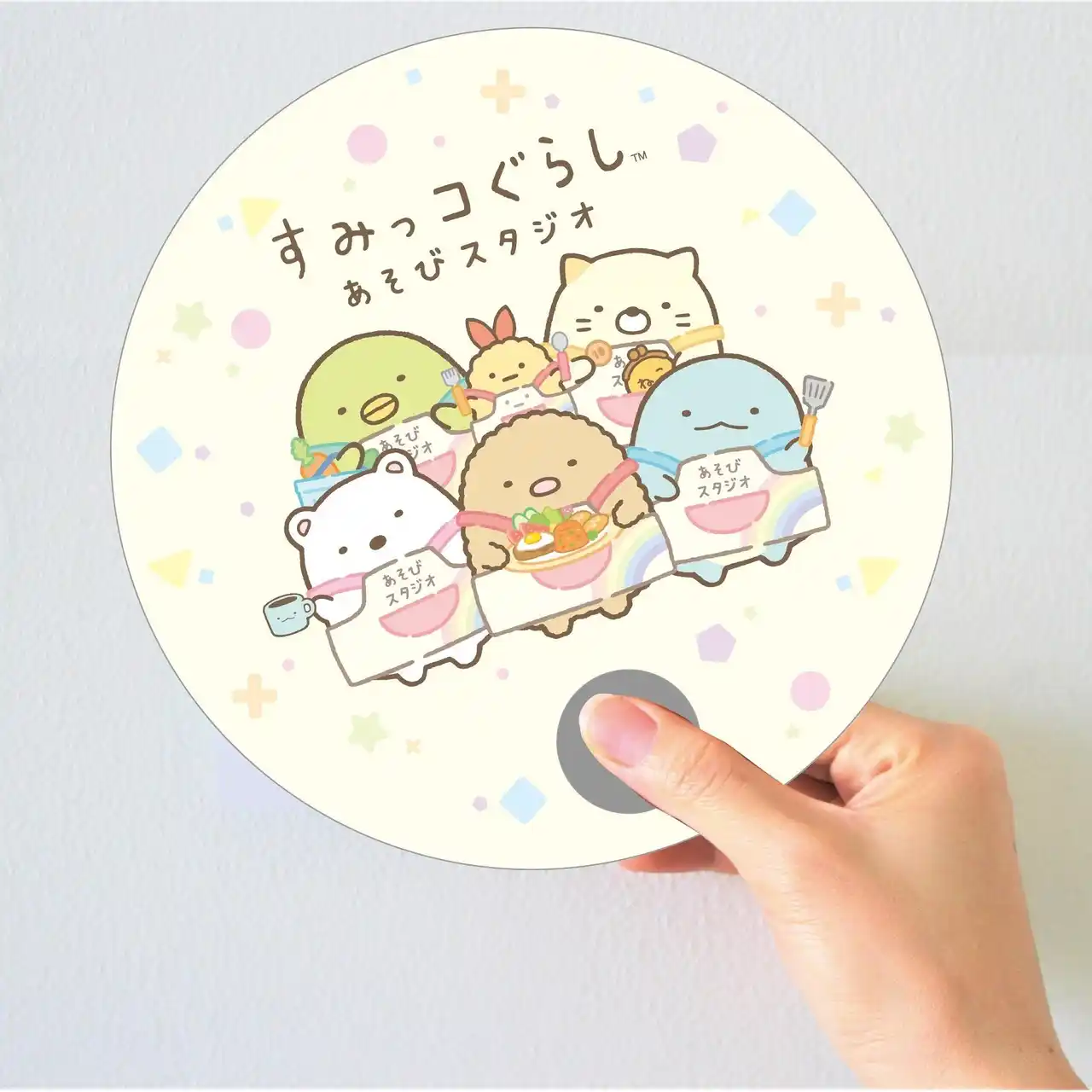 | 入場したお子さまに数量限定で、あそびスタジオ オリジナルアートの「オープン記念シール」をプレゼントします。お子さまが施設で着られるあそびスタジオオリジナルエプロンをすみっコたちも着たかわいいデザインです。 | ||||||||||
