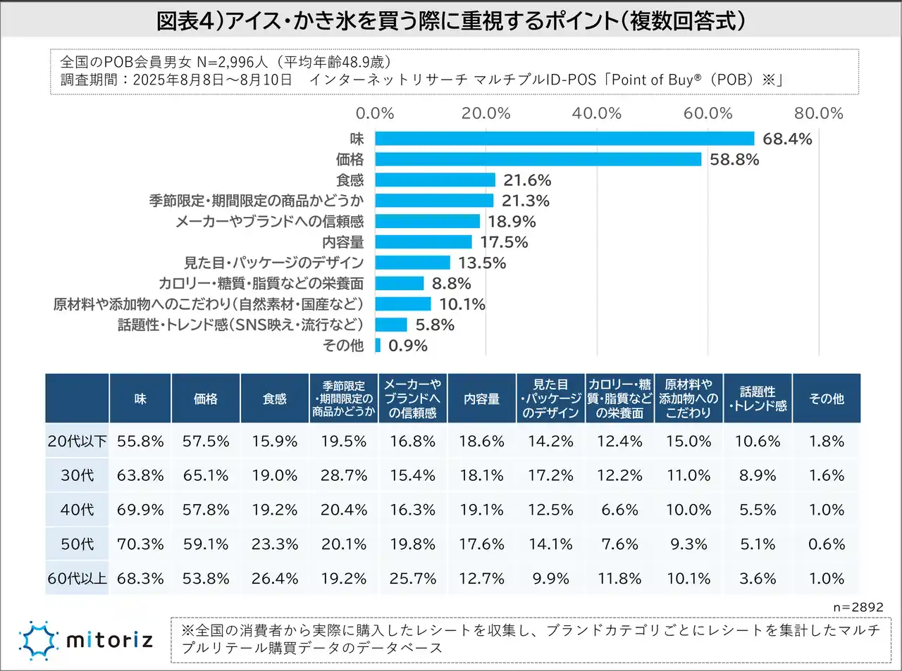 購入時に重視する点は「味」と「価格」が突出しており、年代が上がるほど「価格」から「味」重視へ変化 |