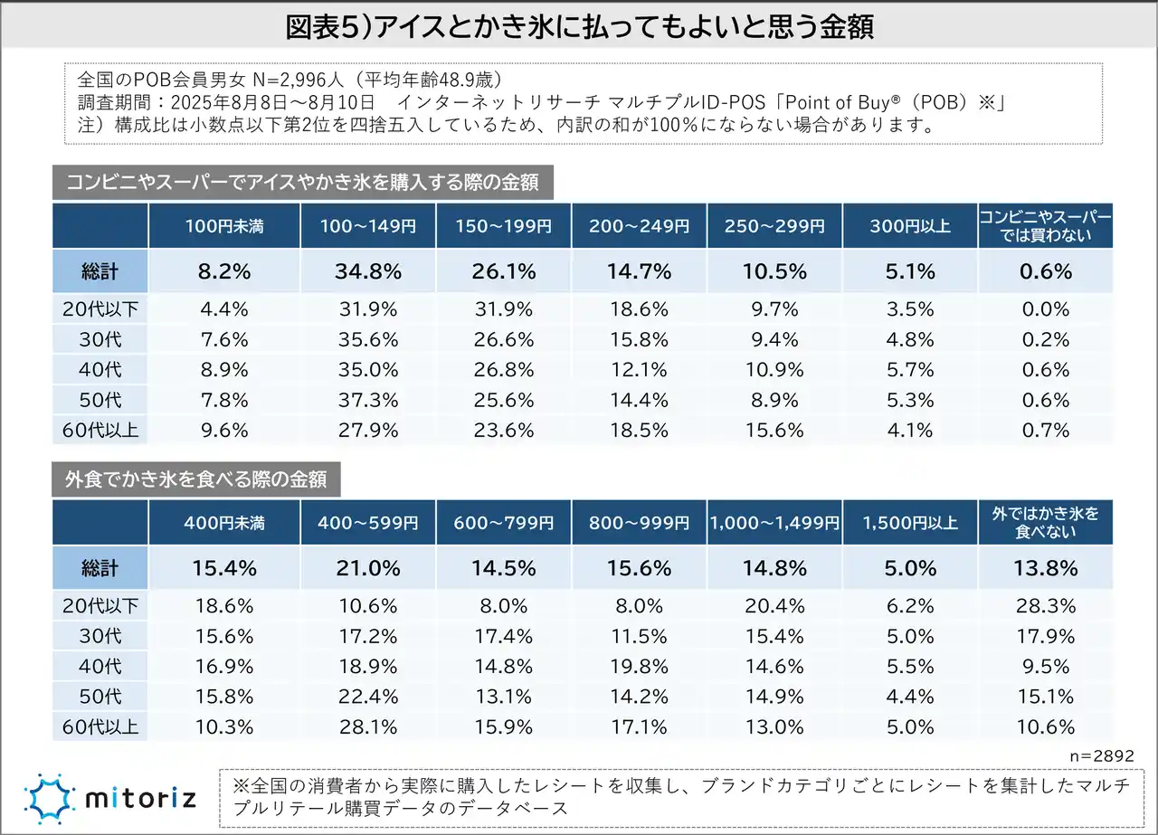【許容価格】コンビニアイスは200円未満が7割、外食かき氷はばらつきがあり2割は1,000円以上でもOK |