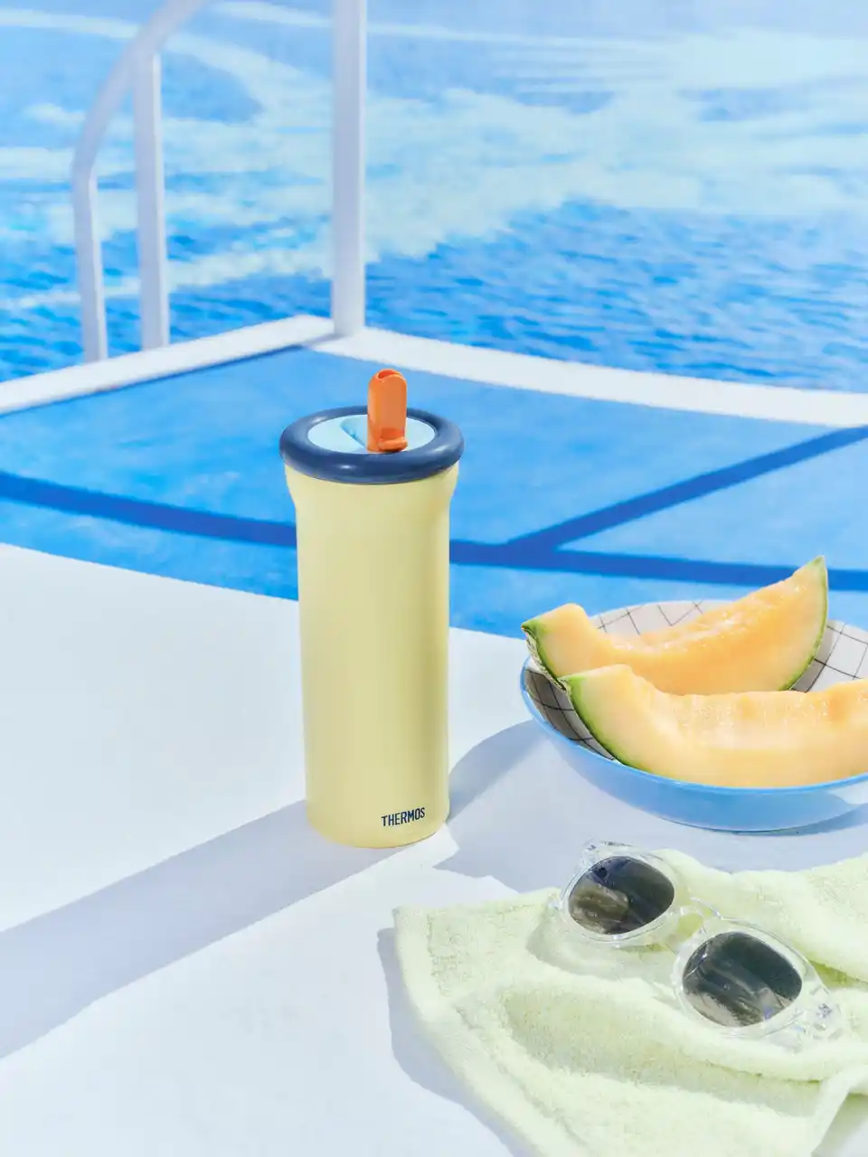 フリップアップ式のストロー搭載。真空断熱構造だから、冷たい飲みものも長く楽しめる! |