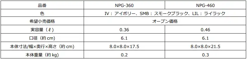 『ウォーターボトル(NPG-360/460)』仕様一覧 |