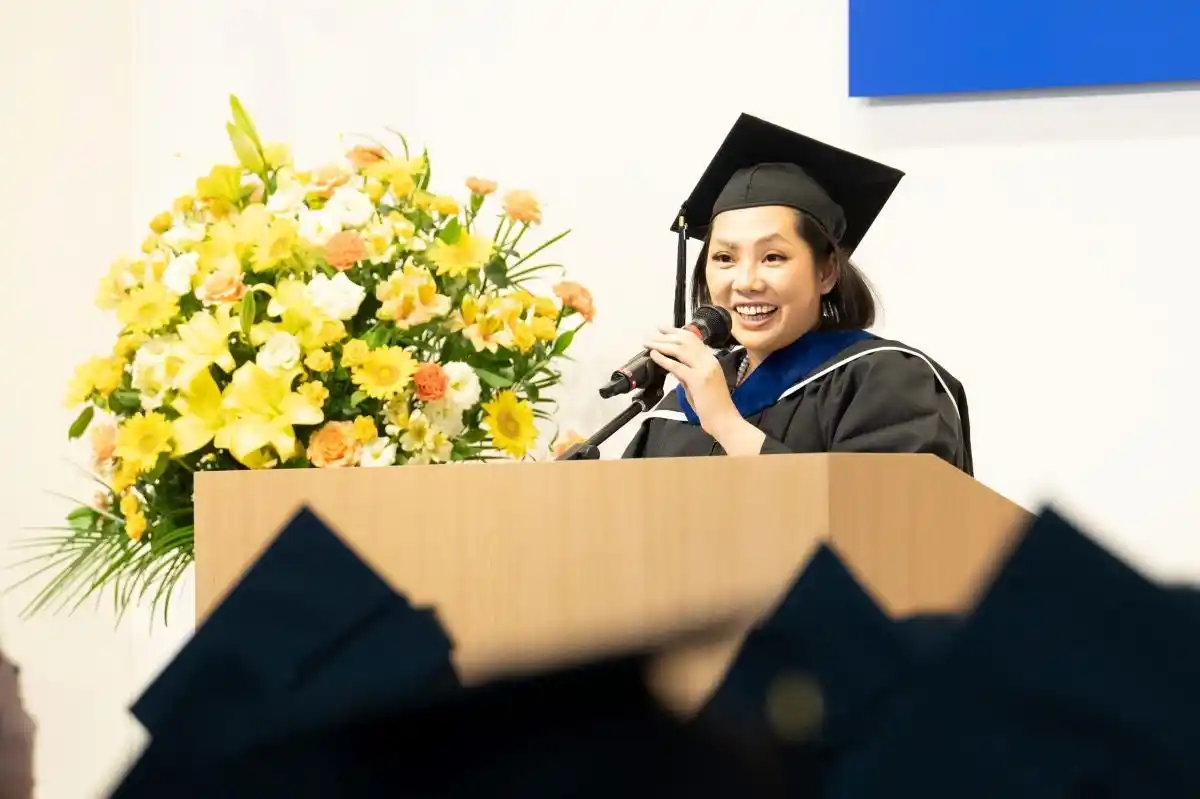 卒業生代表 Renee Lyn Reyes氏(フィリピン出身)は、グロービスで得られた価値を振り返り、それを自身の「3Cのフレームワーク」として表現しました。 「私にとっての3Cは、Community(仲間)、Change(変化)、そして Challenge(挑戦)です。これらが、グロービスという旅の中で私が得たものです。卒業する皆さん、自分自身に“So What?(では自分はどうするのか?)”と問いかけてみてください。そして、思い出してください。1年前の入学式でここに立っていた自分を思い出してください。今のあなたは、その頃から大きく成長し、現実社会の挑戦に立ち向かう準備が整っているはずです」 |