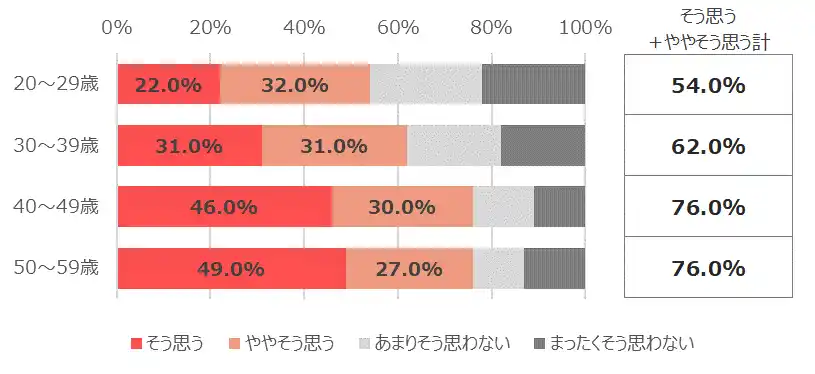 以前に比べて痩せにくくなったと思うか。という質問に対して「そう思う」「ややそう思う」と回答した人の合計は、20代で54.0%、30代で62.0%、40代になると76.0%。年代が上がるにつれて、高くなります。 |