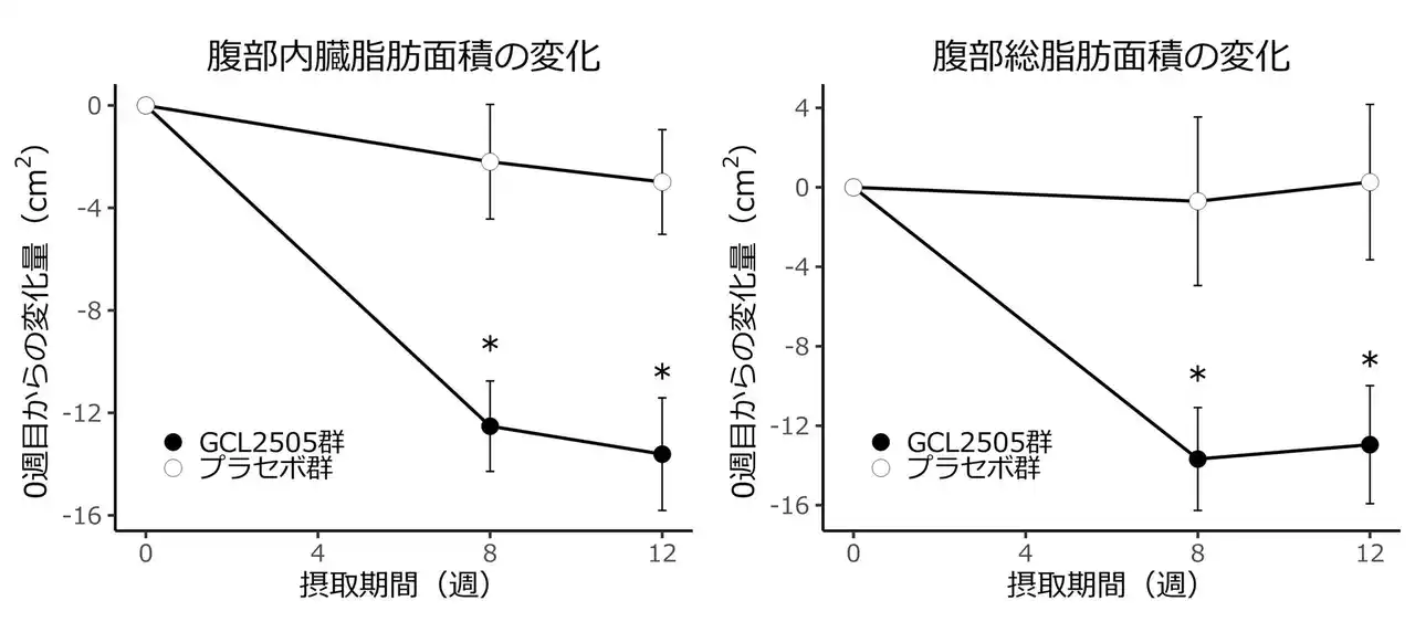 BMIが高め(23以上30未満)の成人男女120名を対象にしたヒト試験の結果、GCL2505株とイヌリンを12週間摂取した群は、プラセボ群と比較して、腸内のビフィズス菌が増え、腹部内臓脂肪と腹部総脂肪が低減しました。 |