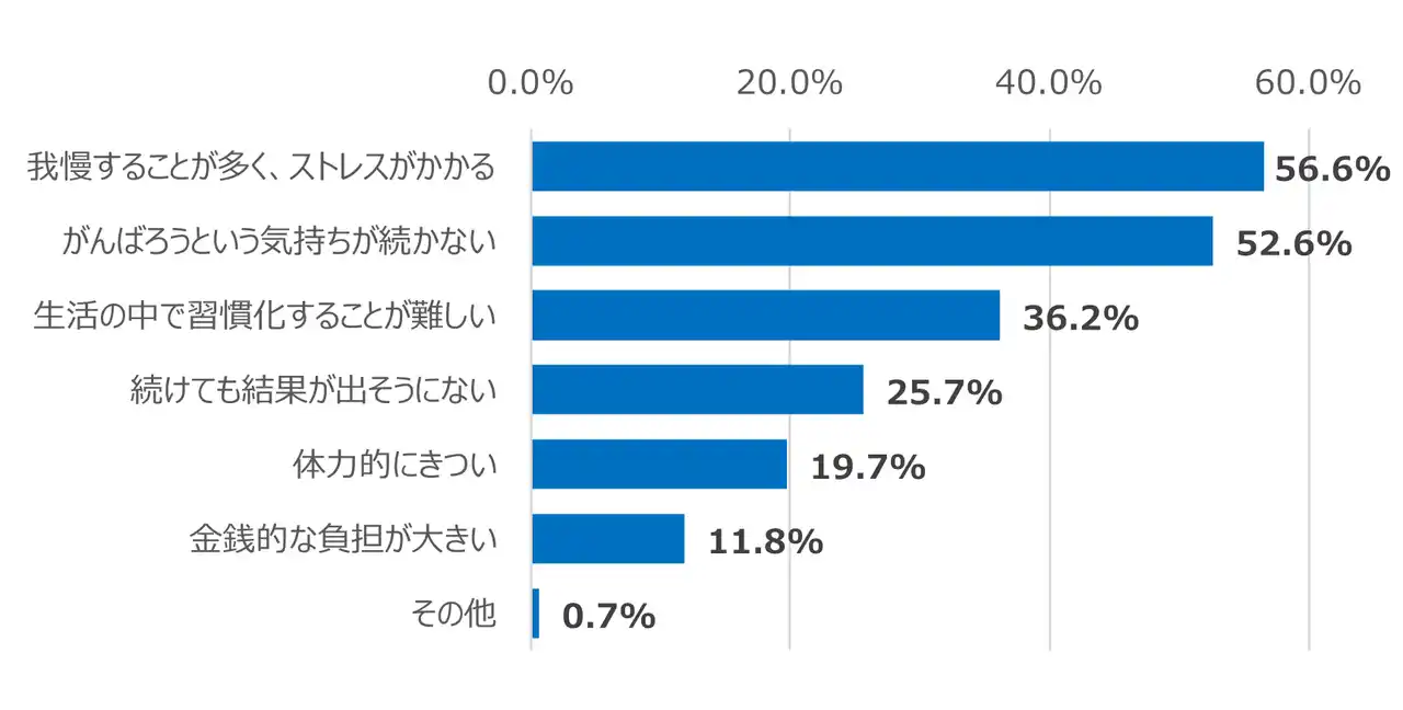 ・ダイエット離脱者の過半数が直面する「1か月継続の壁」。その理由は、「我慢することが多く、ストレスがかかる」(56.6%)、「がんばろうという気持ちが続かない」(52.6%)、「生活の中で習慣化することが難しい」(36.2%)など。 |