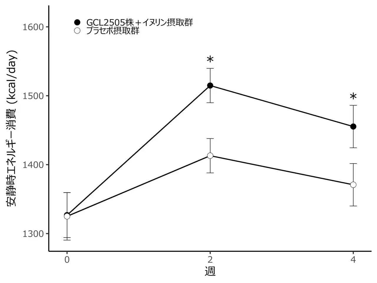 BMIが高め(25以上30未満)の健常な成人男女40名を対象にしたヒト試験の結果、GCL2505株とイヌリンを4週間摂取した群は、プラセボ群と比較して、腸内のビフィズス菌が増え、安静時のエネルギー消費量が増加しました。 |