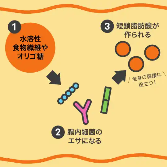 「短鎖脂肪酸」とはビフィズス菌などの腸内細菌が、水溶性食物繊維やオリゴ糖などをエサにして作り出す物質です。近年の研究で、抗肥満作用以外にも、免疫機能の増強や持久力アップなどの健康をサポートする効果があることが明らかになっています。