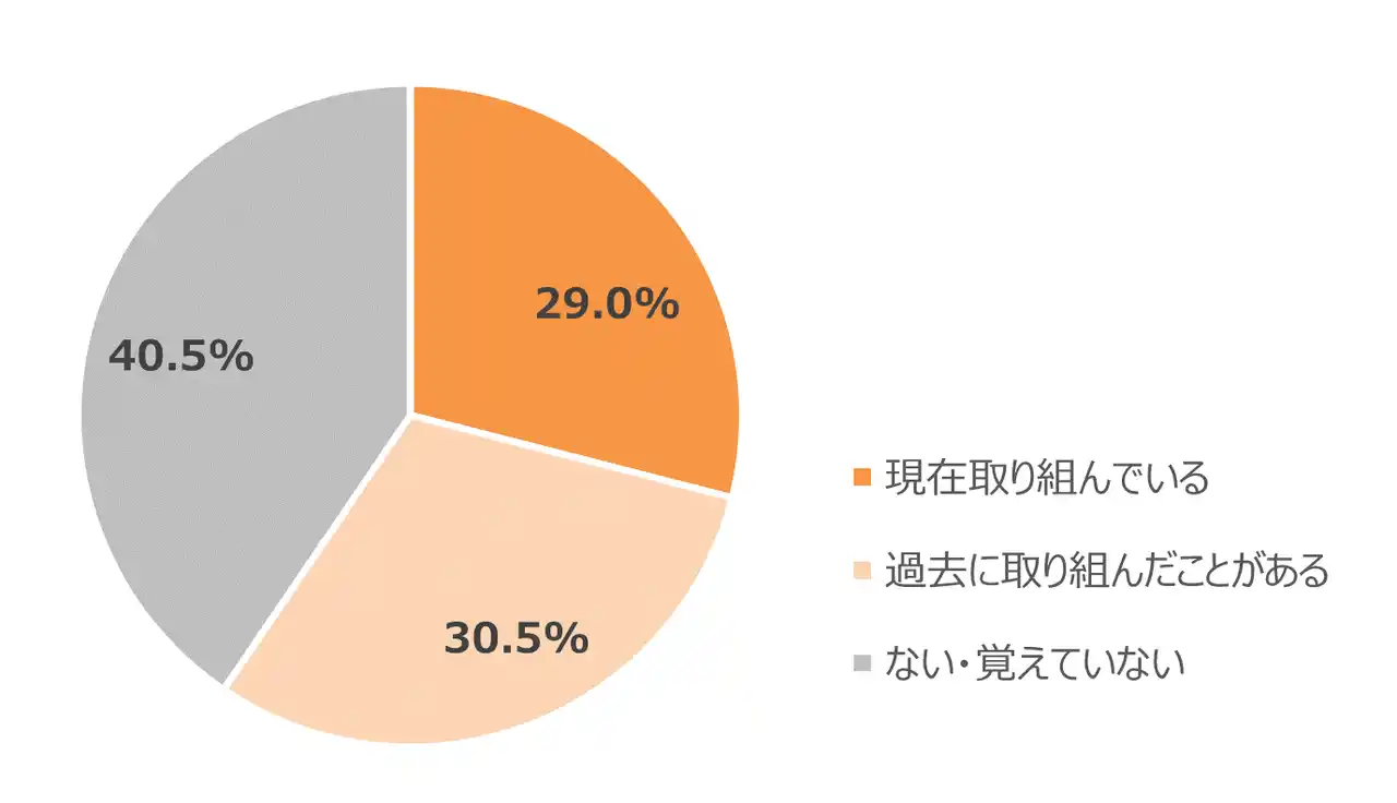 ダイエットについて、「現在取り組んでいる」「過去に取り組んだことがある」をあわせたダイエット経験率は回答者全体で59.5%。一方で、ダイエット経験者の63.9%が、ダイエットを「結果が出る前にやめたことがある」と回答しました。 |