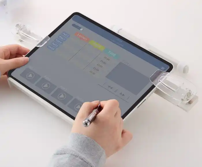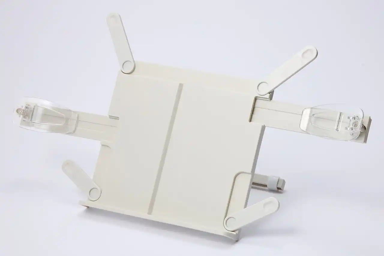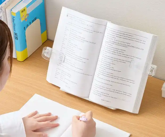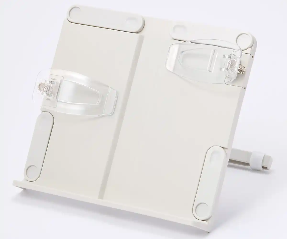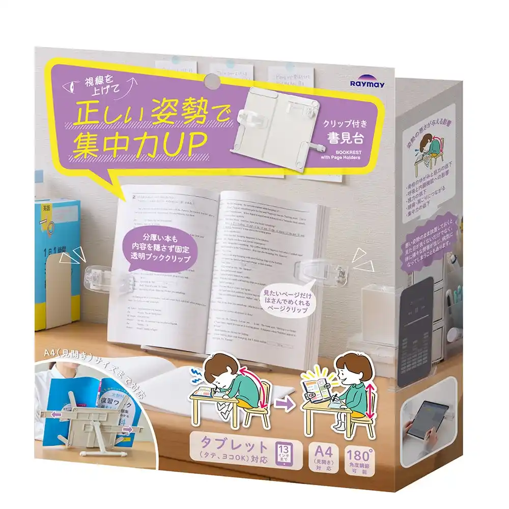 「クリップ付き書見台」は、大きなブッククリップによって、タブレットはもちろん、教科書や参考書などの分厚い本までしっかりと固定でき、学習スペースの効率化をサポートしてくれるアイテムです。 |