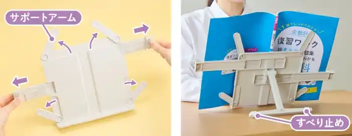 教科書やノート、筆記具などに加え、タブレットも机の上に置く必要があるため、学習スペースが狭く感じられる場面が増えてきました。こうした状況の中で、タブレットや分厚い本でもしっかりと固定でき、限られたスペースを有効活用できるアイテムの開発に取り組みました。 |