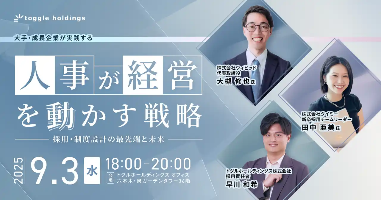 大手・成長企業が実践する「人事が経営を動かす」戦略 ~採用・制度設計の最先端と未来~と題し、人事を起点とした各社の経営戦略について、ざっくばらんにパネルディスカッションするイベントが開催されることとなりました。後半にはネットワーキングイベントもございますので、ぜひ奮ってご参加ください。 |