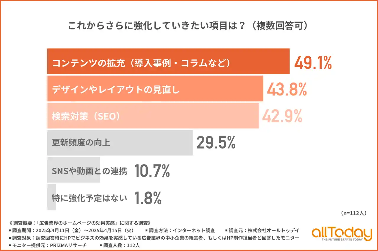 また、今後の強化ポイントとして「コンテンツ」「デザイン」「SEO」が上位に挙がっており、運用面の戦略的な見直しが求められていることが明確となりました。 |