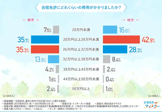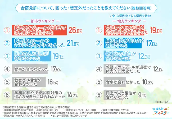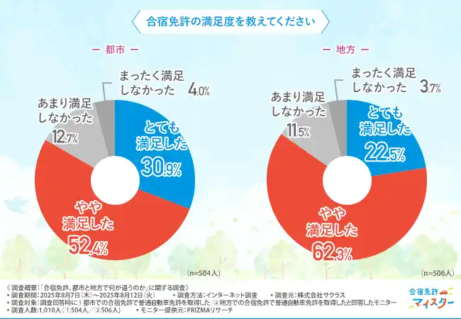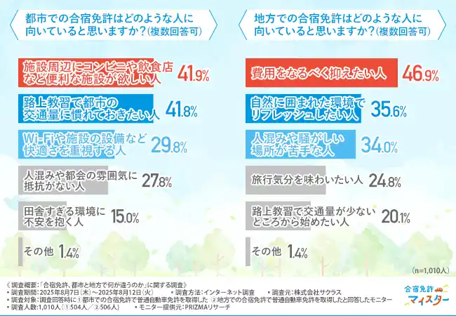 株式会社サクラス(所在地:東京都中央区、代表取締役:山本 謙介)は、1.都市での合宿免許で普通自動車免許を取得した方/2.地方での合宿免許で普通自動車免許を取得した方を対象に、「合宿免許、都市と地方で何が違うのか」に関する調査を実施しました。