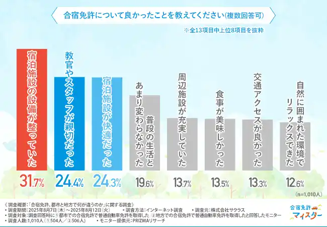 「合宿免許について良かったこと」について尋ねたところ、『宿泊施設の設備が整っていた(31.7%)』が最も多く、『教官やスタッフが親切だった(24.4%)』『宿泊施設が快適だった(24.3%)』と続きました。 |