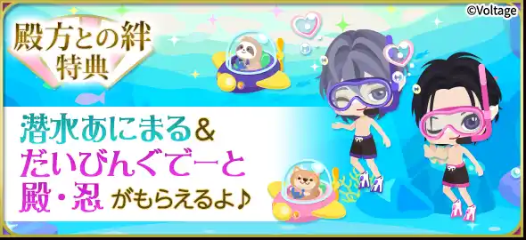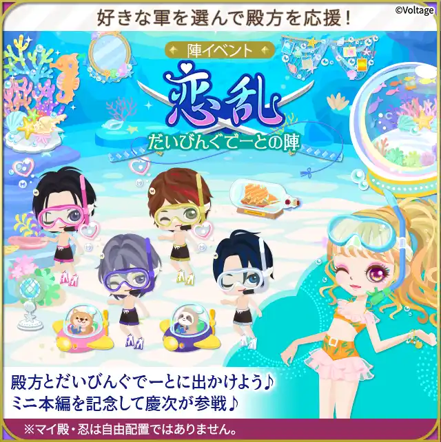 また、同時開催の陣イベントでも慶次が参戦いたします。「ダイビングデート」をテーマに様々な特典をご用意しておりますので、特典のアバターを集めて殿方との楽しい海でのひとときをお楽しみください。 |