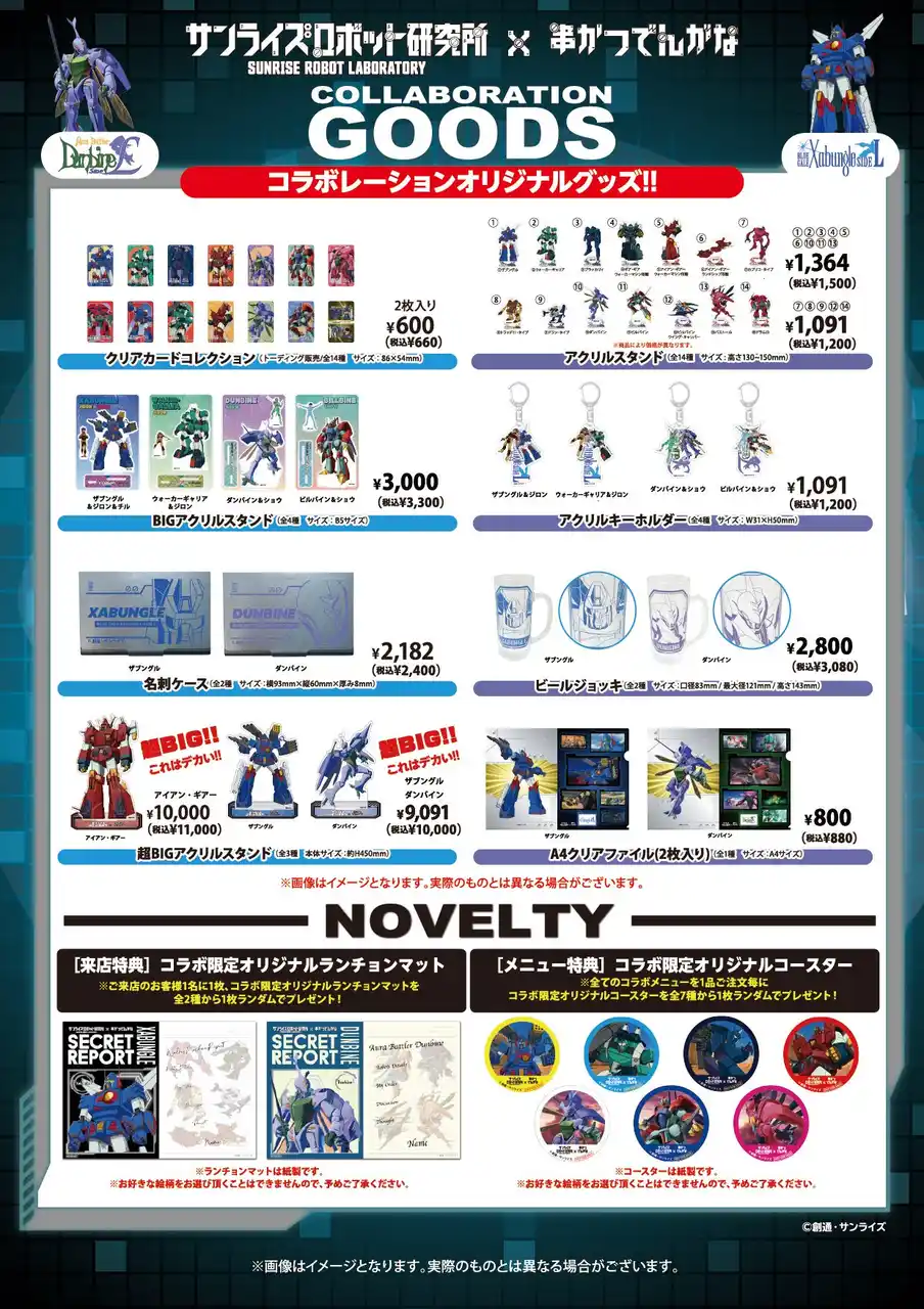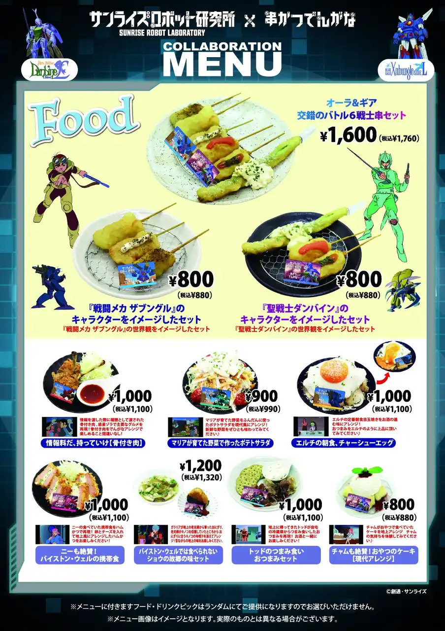 コラボメニュー 『戦闘メカ ザブングル』、『聖戦士ダンバイン』の作中シーンやキャラクターをモチーフにした食事やドリンクをでんがな風にアレンジしてメニュー化 |