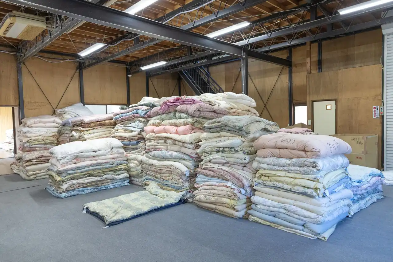 | 昨年、東京23区内で回収された粗大ごみの個数1位は布団で、97.6万枚にものぼります(令和4年度 東京23区清掃一部事務組合 清掃事業年報)。また、寝具全体で見たときには、日本で毎年1億枚以上が廃棄され、リサイクルはわずか2%にとどまります。 | |||||||||