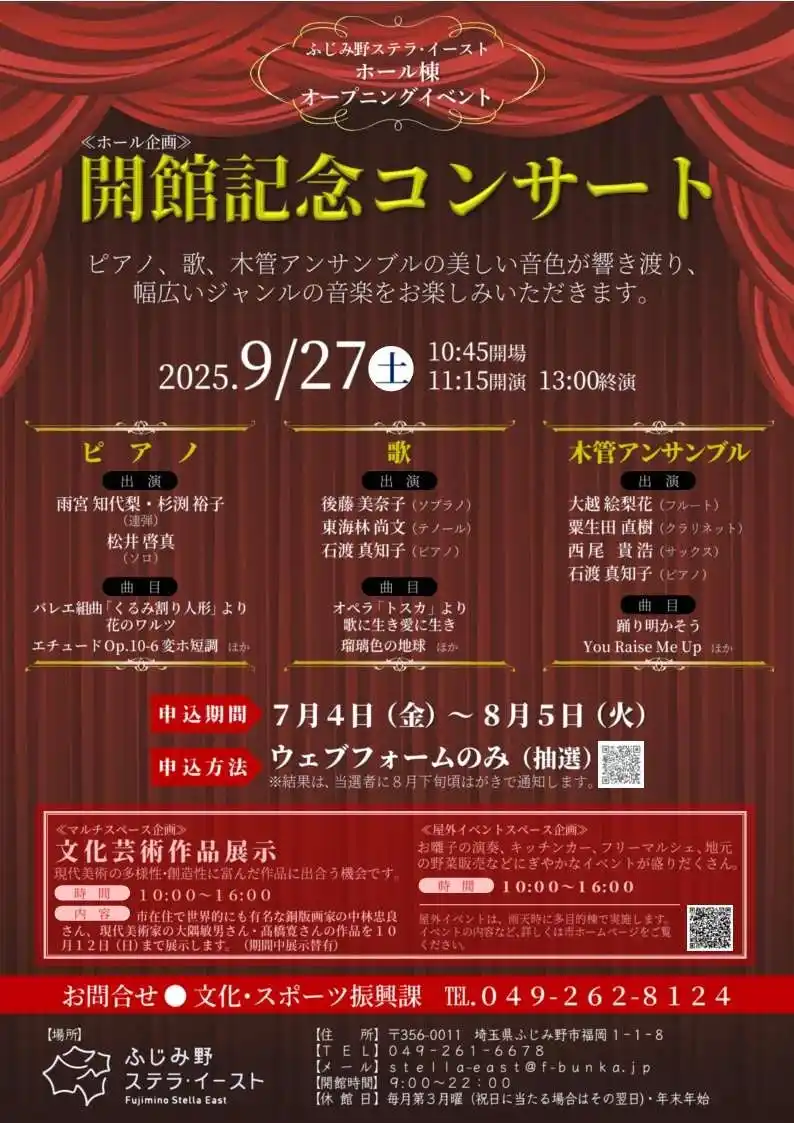 | 音響に特化し、日本では数少ないファツィオリ社製のグランドピアノを設置した322席のホールと、展示などを開催できるマルチスペースに、新たに屋外イベントスペースを併設した「ふじみ野ステラ・イーストホール棟」が9月27日(土)にリニューアルオープンします。当日のイベントでは、さまざまな催し物を予定しております。ぜひ、ふじみ野市の新しい文化施設に足をお運びください。 | ||||||||