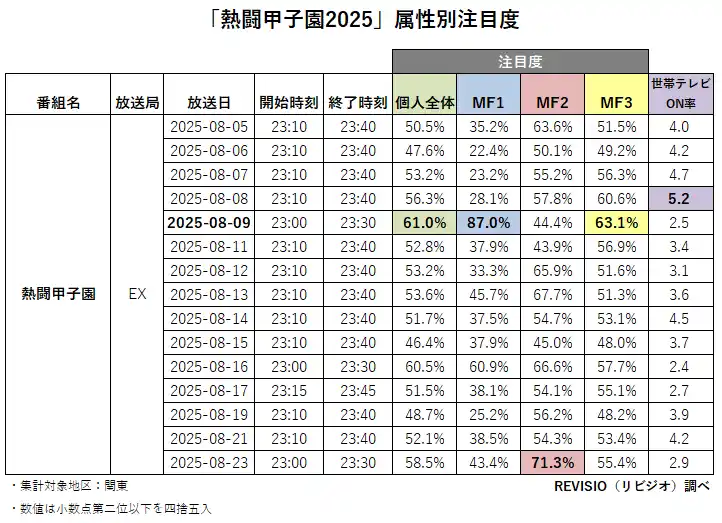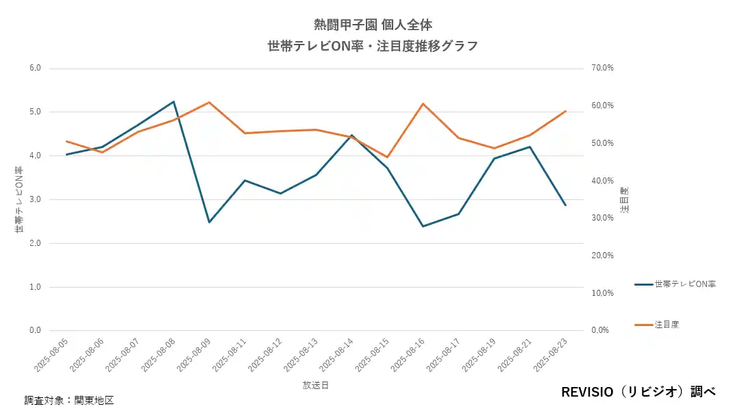 「熱闘甲子園2025」個人全体世帯テレビON率・注目度推移グラフ画像 |