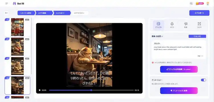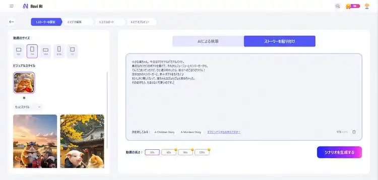 Novi AIは、テキストとAI技術を組み合わせることで、誰でも簡単に高品質な動画を制作できる革新的なツールです。ユーザーが入力した一言をもとに、AIがストーリーを生成し、それに沿った映像を自動で構築。SNSでのプロモーション動画や、子ども向けの教育アニメーションなど、幅広いシーンで活用されています。 |