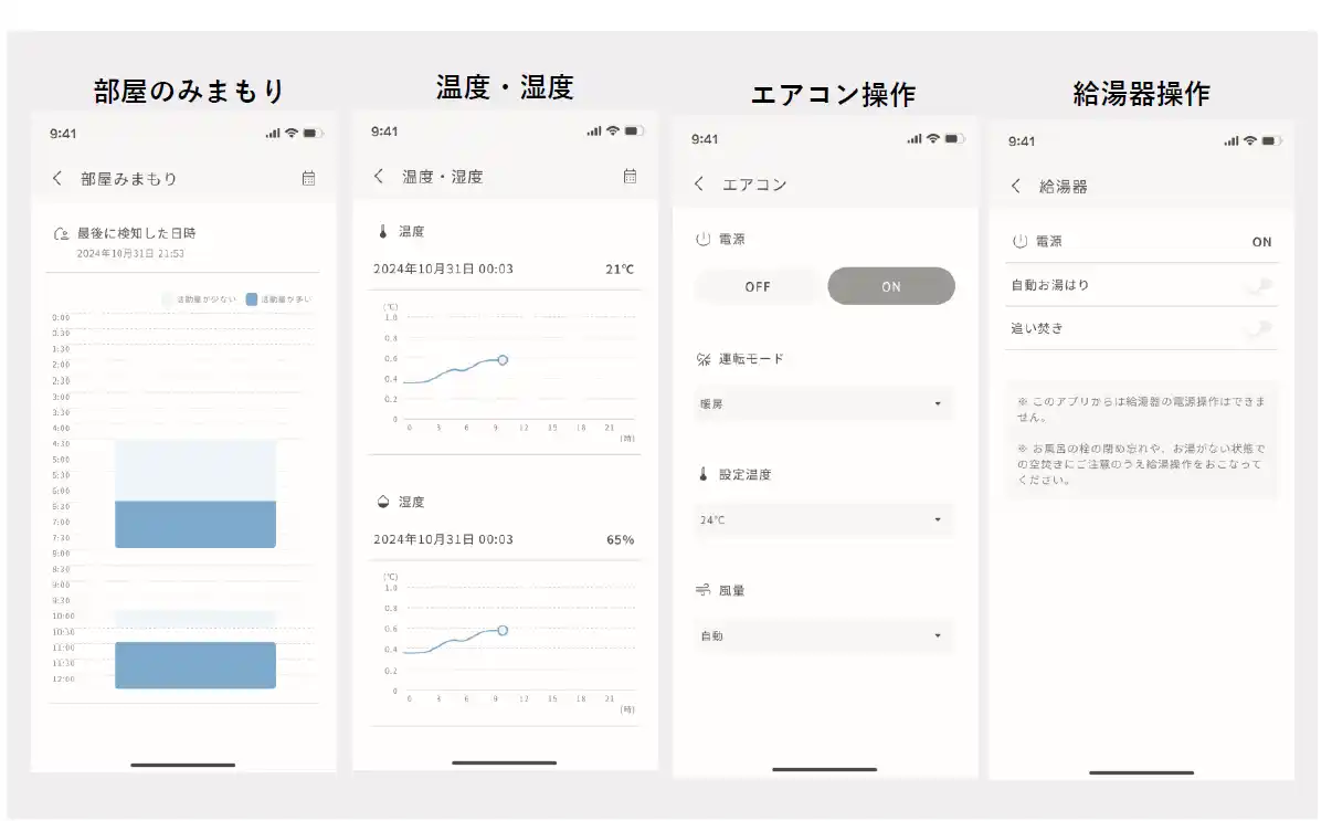 mui Homeアプリから、エアコンや給湯器の操作が可能で、部屋のみまもり(人感センサー)や温度・湿度の確認もすることができます。 |