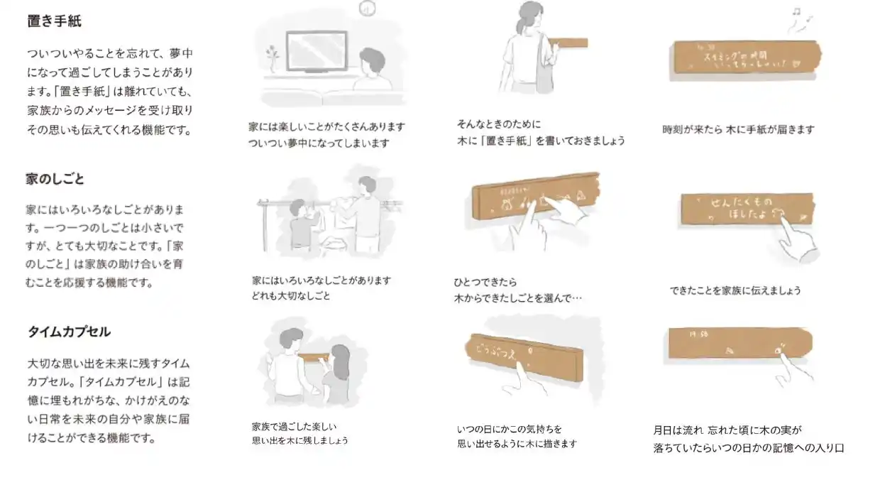 UXリサーチを通して得られた共働き家族の課題に対し、「家族の“思い”や“つながり”を感じられること」「コミュニケーションのきっかけを生むこと」「直感的に使えること」を大切にして上記新機能開発を進めました。 |