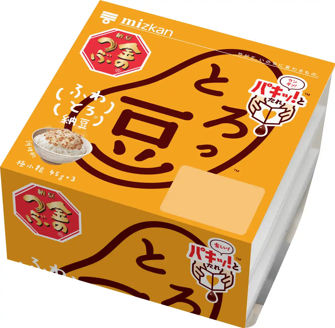 「金のつぶ パキッ!とたれ とろっ豆」は、フィルムやたれ袋が無い「パキッ!とたれ」を採用し、パキッ!とふたを割るだけでまろやかなたれをかけることができる、とろけるくらいやわらかい豆とふわふわの糸引きが特徴的な納豆です。 |