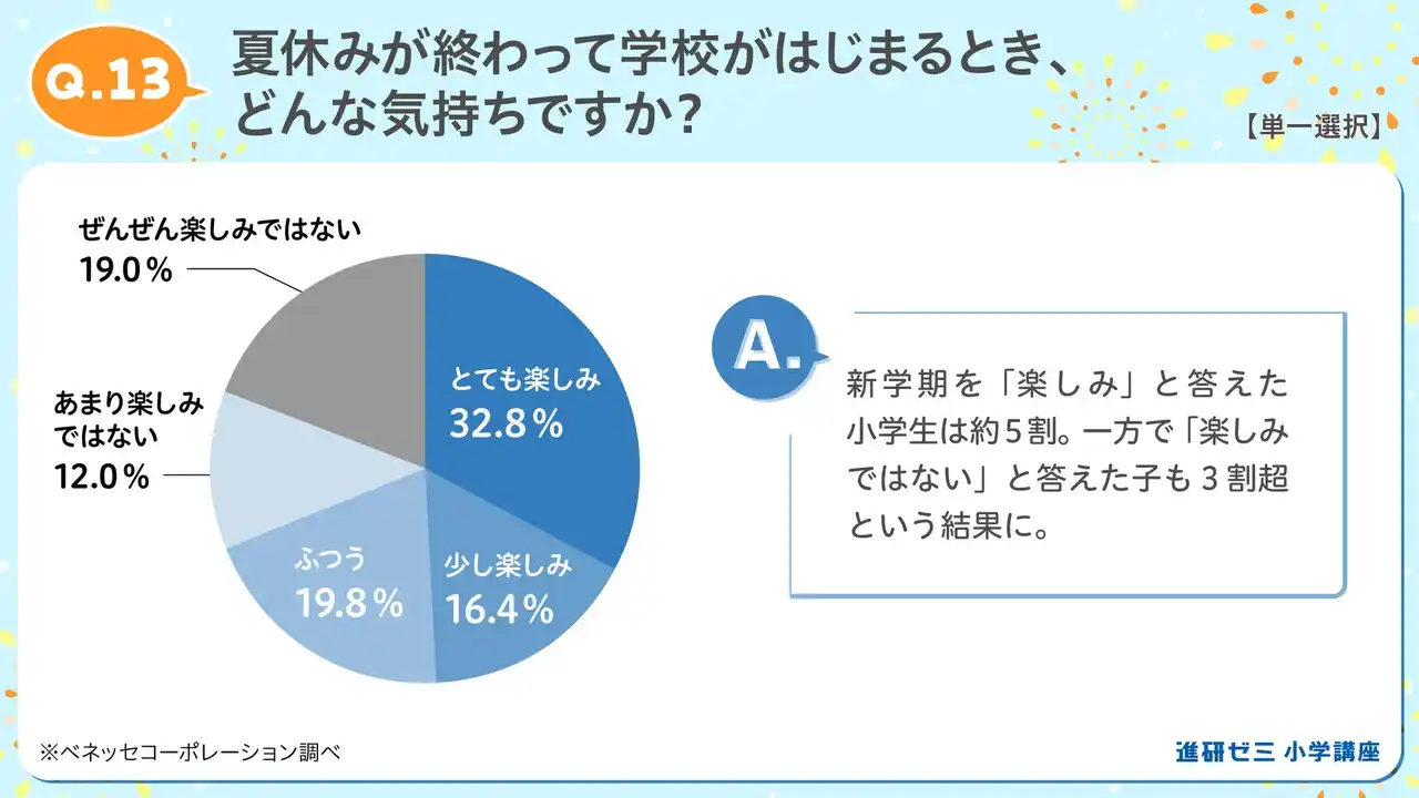 株式会社ベネッセコーポレーション(本社:岡山県岡山市、代表取締役会長兼社長:岩瀬大輔)が提供する通信教育講座「進研ゼミ 小学講座」では、「夏休みの過ごし方と新学期に関する意識調査」を小学生向けに実施しました。 |