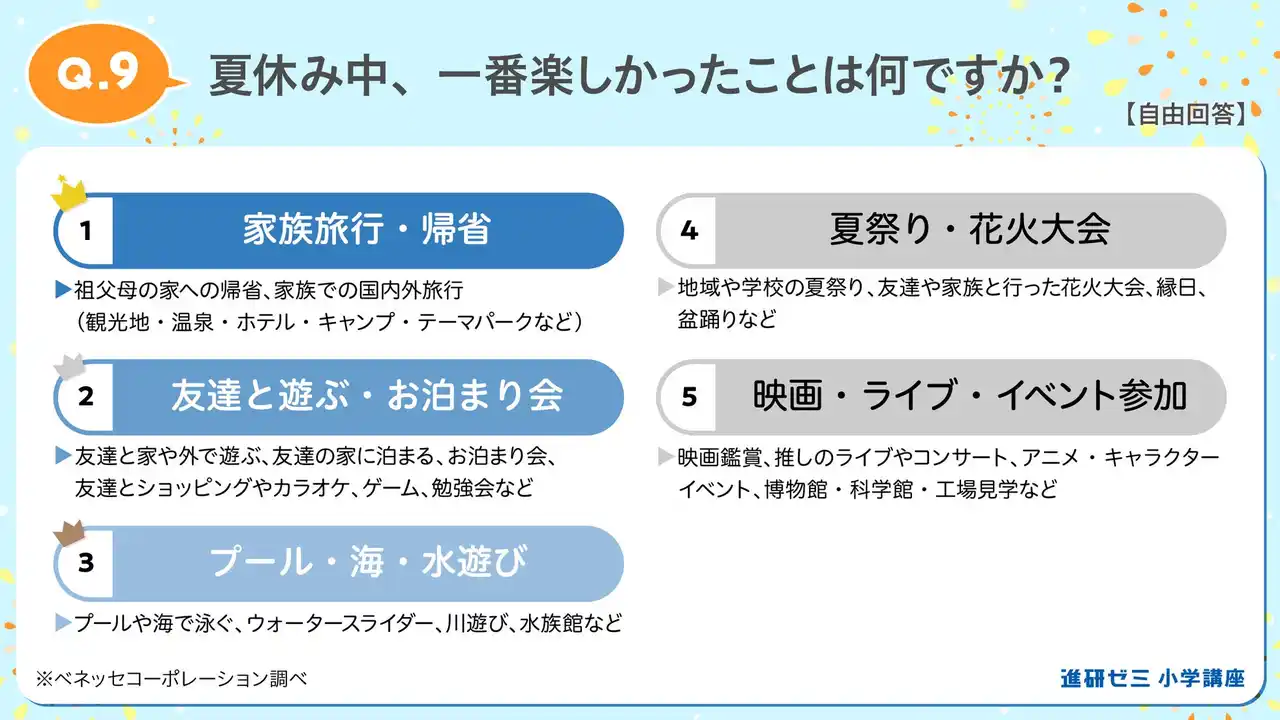 8. この夏休み、どんなことをして過ごしましたか?【複数選択】 この夏休みの過ごし方1位は「家でゆっくり」。2位「ゲーム」、3位「読書」と、室内での活動が上位に。家族旅行や習い事、友達と遊ぶなども子どもたちの夏を彩りました。 |