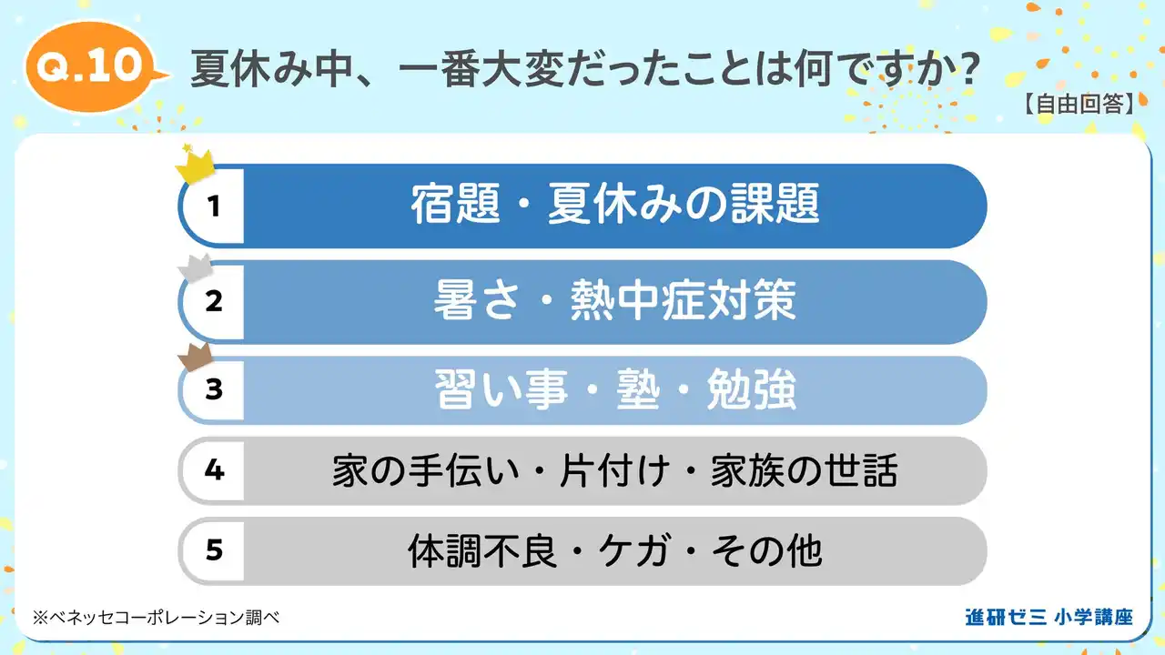 10. 夏休み中、一番大変だったことは何ですか?【自由回答】 |