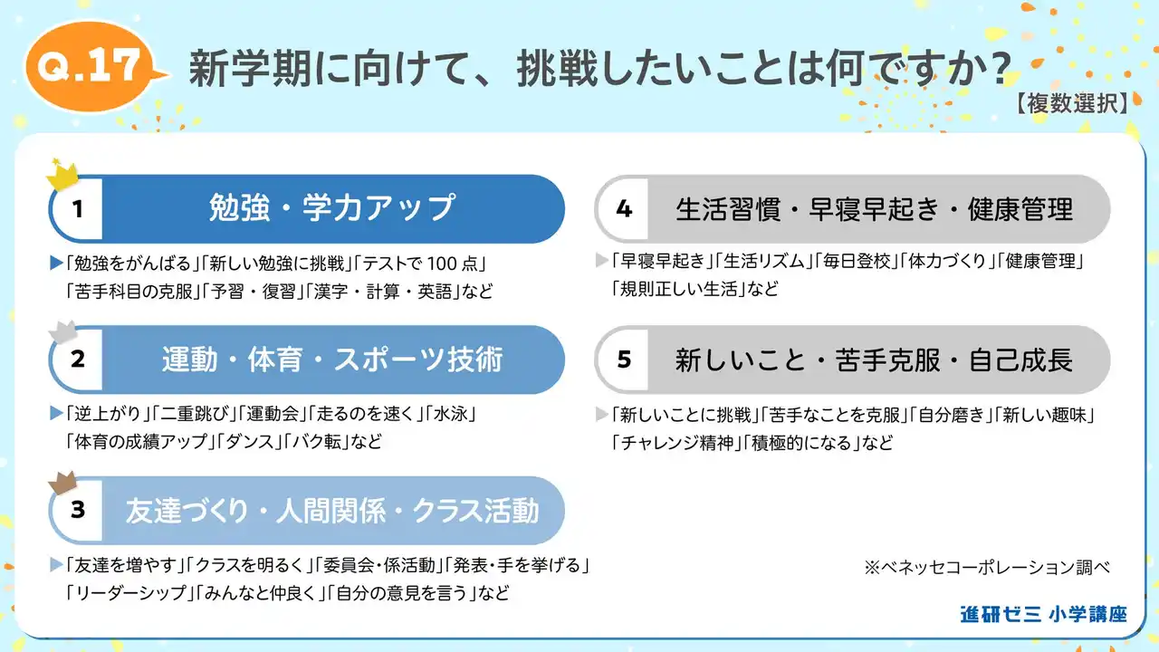 17. 新学期に向けて、挑戦したいことは何ですか?【複数選択】 新学期に挑戦したいことの1位は「勉強・学力アップ」。次いで「運動・体育・スポーツ」「友達づくり・人間関係・クラス活動」「生活習慣・早寝早起き・健康管理」「新しいこと・苦手克服・自己成長」と、学びや成長に前向きな意欲が目立ちました。 |
