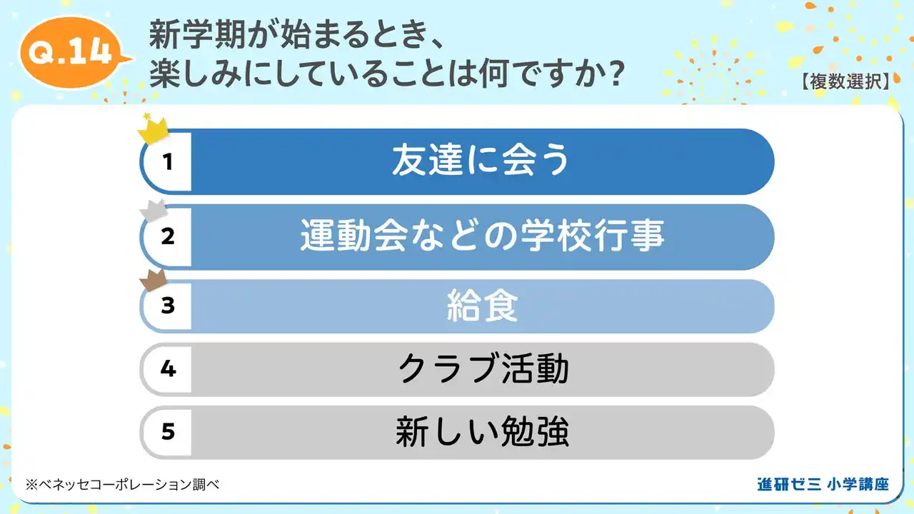 14. 新学期が始まるとき、楽しみにしていることは何ですか?【複数選択】 新学期の楽しみは「友達に会う」が最多。次いで「運動会などの学校行事」「給食」「クラブ活動」「新しい勉強」が続き、学校生活への期待がうかがえました。 |