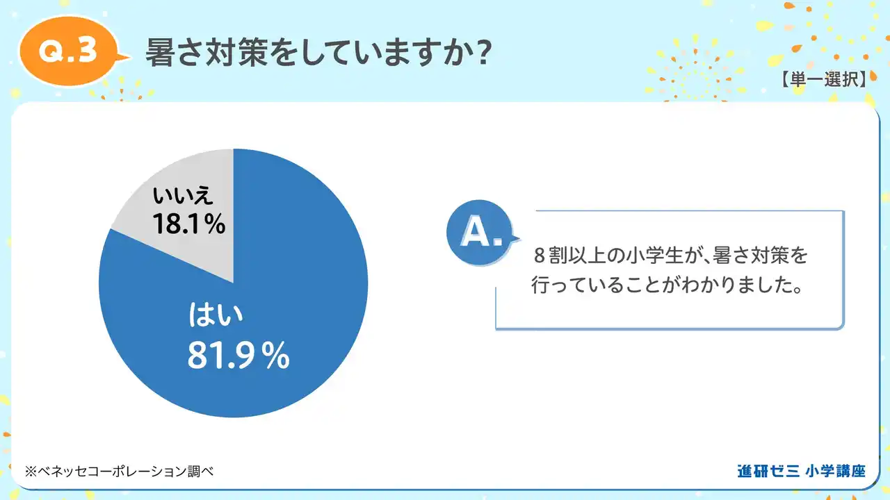 3. 暑さ対策をしていますか?【単一選択】 81.9%の小学生が、暑さ対策を行っていることがわかりました。 |