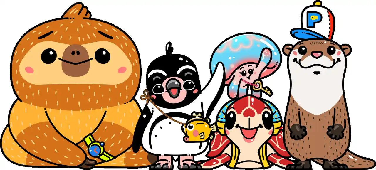 館内の人気者・フンボルトペンギンのキャラクター「ぺタタ」は、水族館で生まれ育ったフンボルトペンギン。いつもガラス越しに笑顔で見守ってくれるお客様が大好きで、「もっとたくさんの人を笑顔にしたい」という思いから、水槽の外へ“仲間探しの冒険”に出かけます。館内を歩き回るぺタタは、旅の途中でナマケモノの「ノロロ」、カワウソの「パタタ」、クラゲの「キララ」、ウミガメの「ユララ」と出会います。みんなに想いを共有することで新たな仲間として迎え入れます。こうして結成されたのが、笑顔を届けるチーム「TEAM SMILE HAPPY!」です。 |