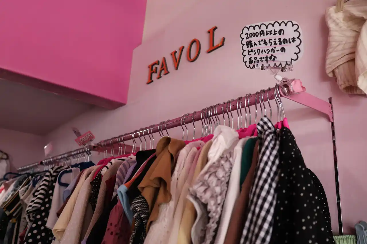 | Favolにある商品は、1,000円(税込)・2,000円(税込)・3,000円(税込)の3種の価格帯のみ。ハンガーの色で金額を分けるシステムを採用し、合計金額を現金またはPayPayにて支払います。 | ||||||||||||||