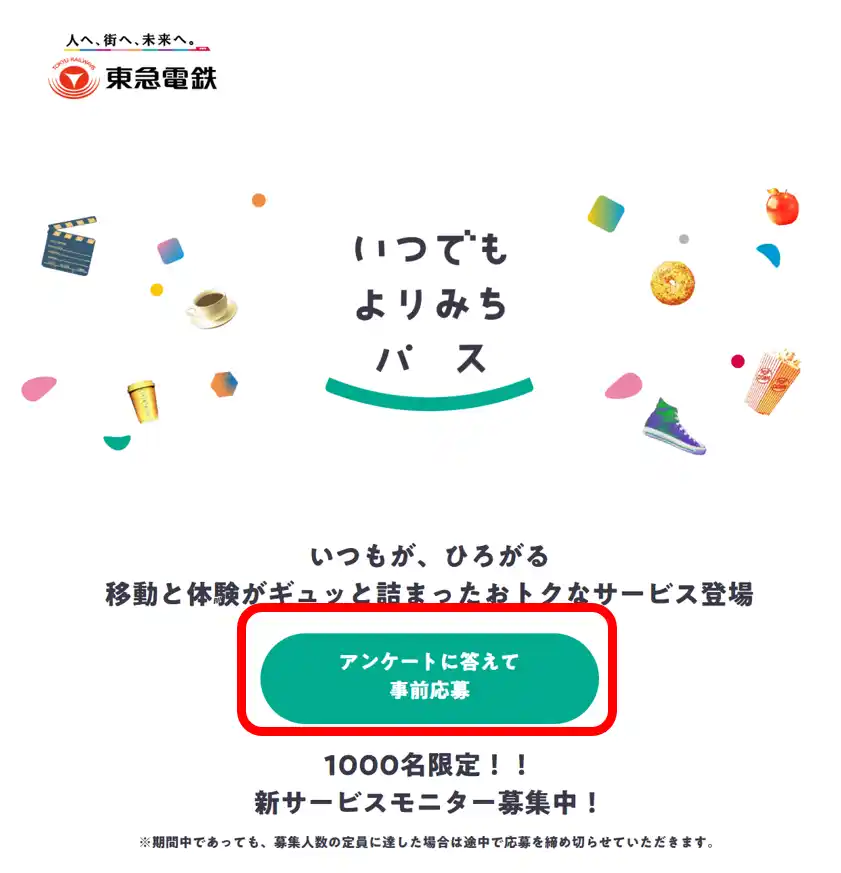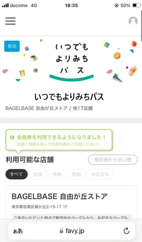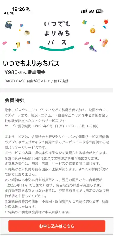 スマートフォンの故障、電池切れ、通信障害、紛失、お忘れなどにより、「いつでも よりみちパス」の特典利用ページが表示できない場合は、本サービスをご利用いただけません。 |
