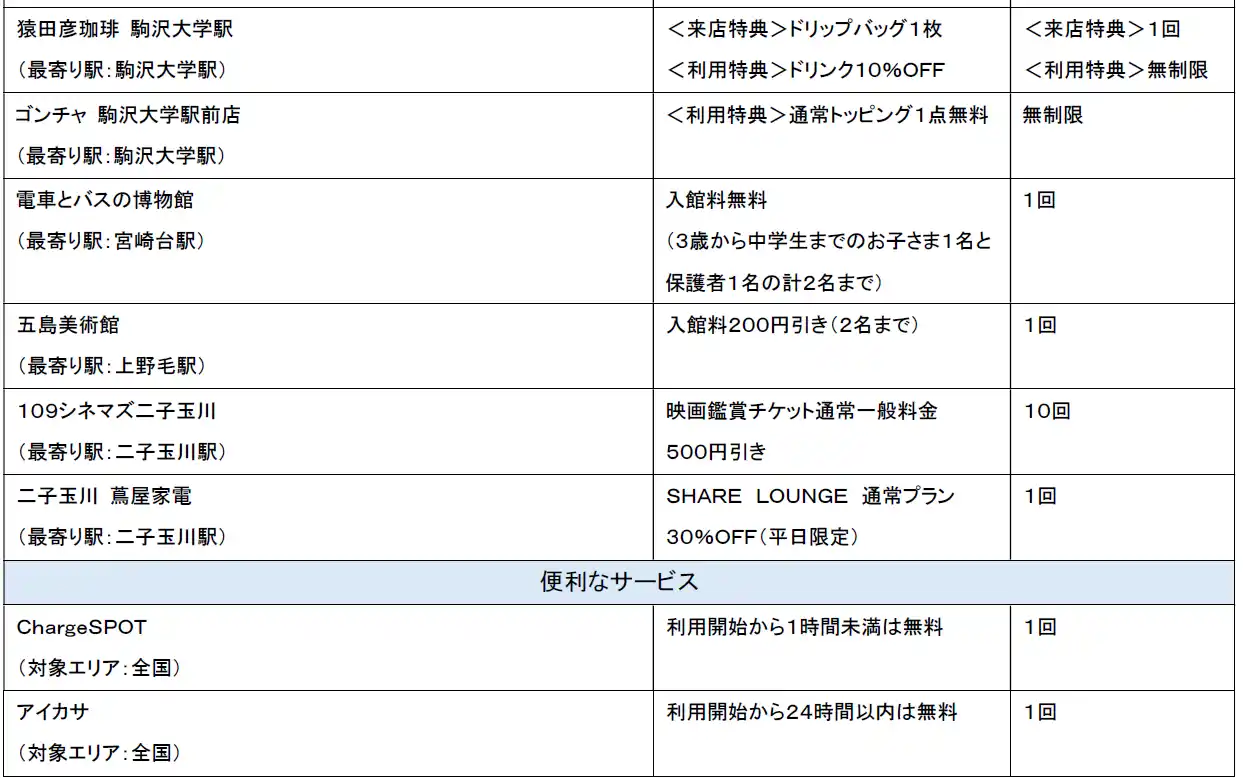 施設・店舗、その他サービスによって、提供サービスの内容(無料もしくは割引、利用可能回数制限など)が異なります。詳細は以下の表をご確認ください。 |