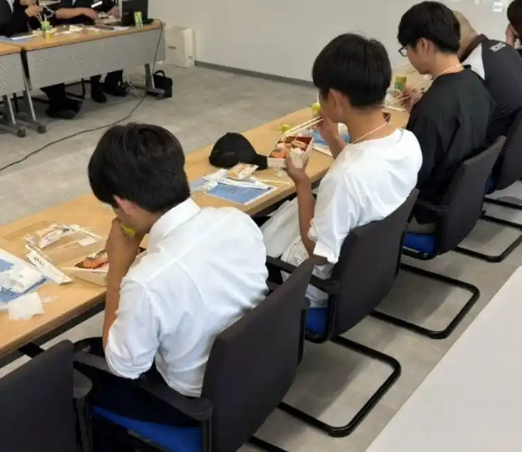 昼食には弊社が日頃より配送を行っているコンビニエンスストアの弁当とスイーツを提供。弁当を食べながら弊社のイメージ動画などを見ていただきました。見学会後に食べることで物流の一端を感じてもらえたと思います。 |