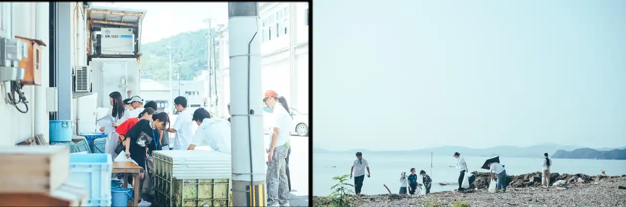 二日間の始まりは、佐伯市葛港にて魚介卸売業を営む(有)丸昌水産代表取締役社長・中嶋宏光氏よる実際の作業現場を見せてもらいながらの物流から見える魚や海の変化、魚介類研究家・池田健太郎氏による佐伯の海の魅力や価値・課題についてレクチャーを受ける学びの時間を実施。その後、シュノーケリングで海中を泳ぐ魚や海底の藻場の様子を観察したり、浜辺に打ちあげられた海洋ごみのビーチクリーンを行い、実際に海に触れることでの学びを体験しました。