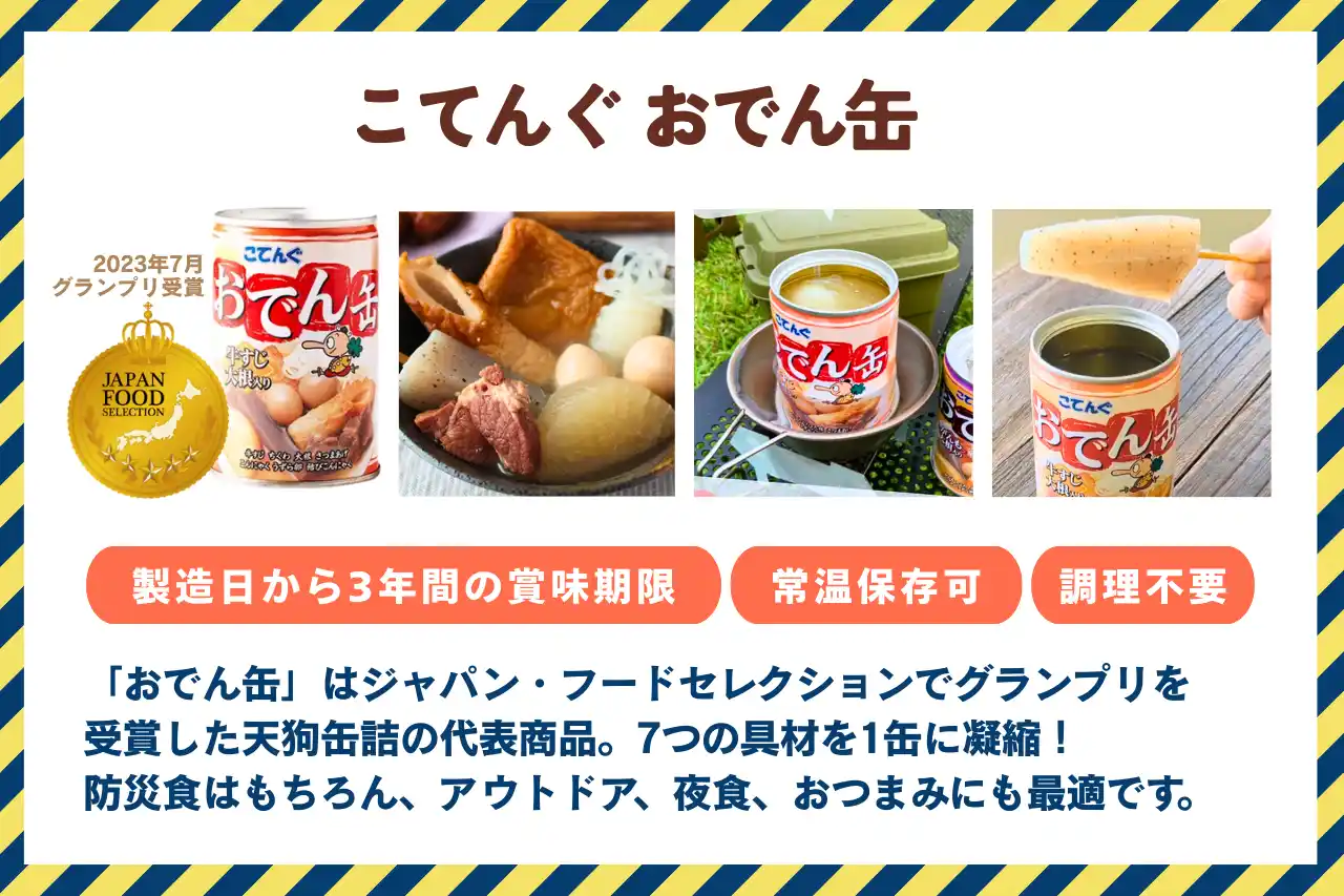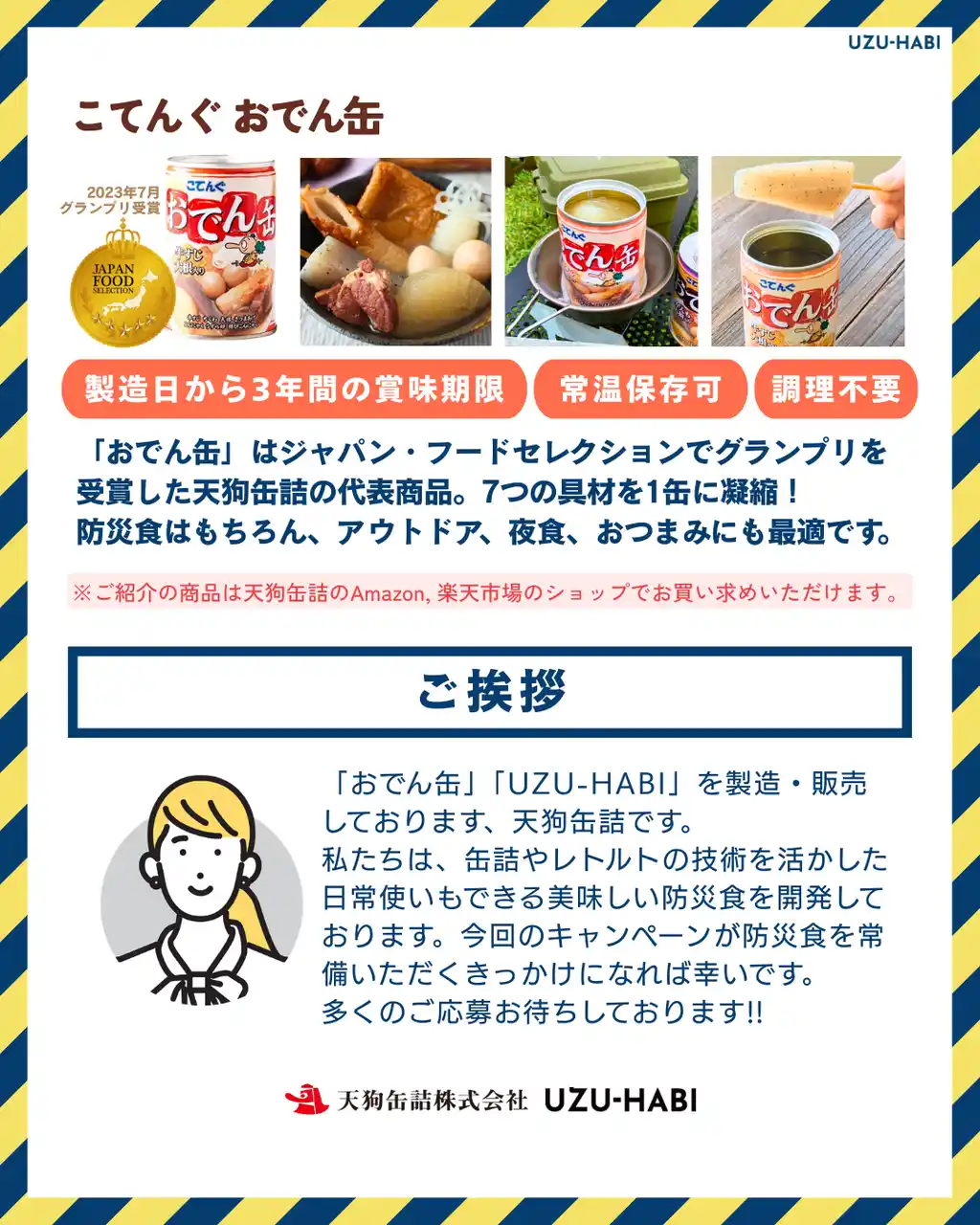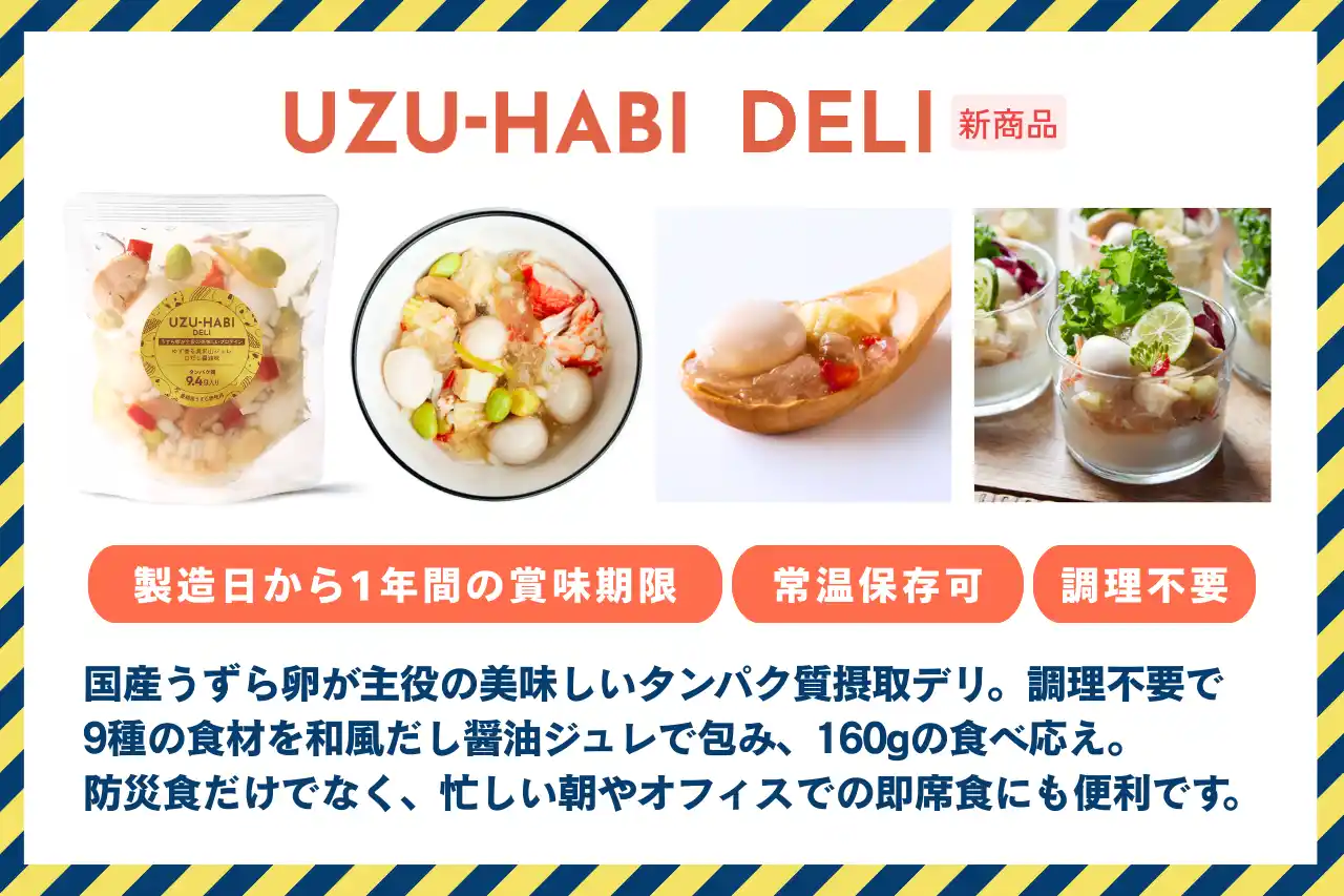 天狗缶詰株式会社(本社:愛知県、代表取締役社長:伊藤 圭太郎)は、9/1の防災の日に向けて、自社の代表商品「おでん缶」に続く防災食の新商品「UZU-HABI(ウズハビ)」を開発しました。また、防災食の備蓄啓発を目的とした「美味しい防災食」プレゼントキャンペーンを、Instagramにて2025年8月25日(月)~9月7日(日)まで実施します。 |