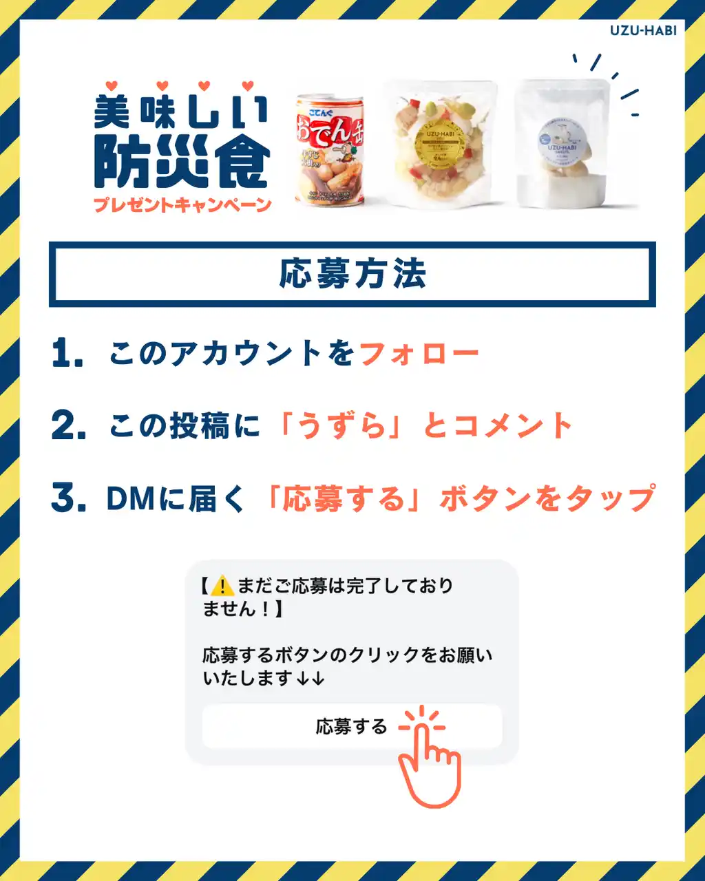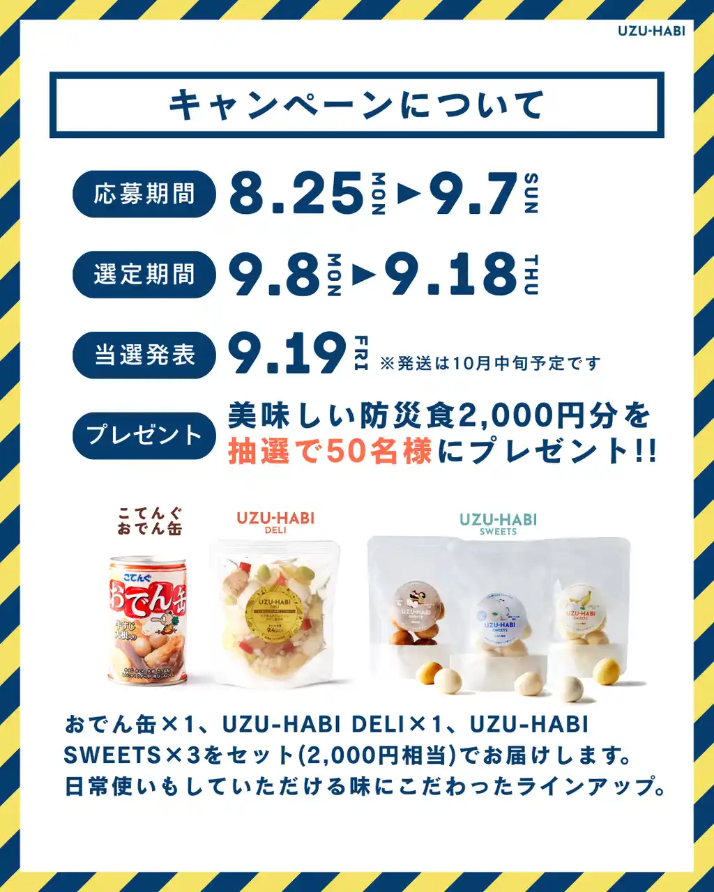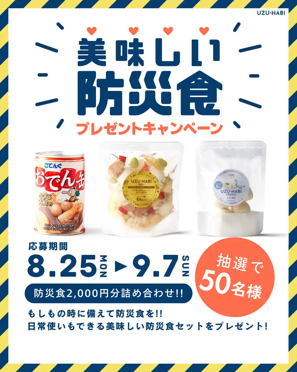 天狗缶詰株式会社(本社:愛知県、代表取締役社長:伊藤 圭太郎)は、9/1の防災の日に向けて、自社の代表商品「おでん缶」に続く防災食の新商品「UZU-HABI(ウズハビ)」を開発しました。また、防災食の備蓄啓発を目的とした「美味しい防災食」プレゼントキャンペーンを、Instagramにて2025年8月25日(月)~9月7日(日)まで実施します。 |