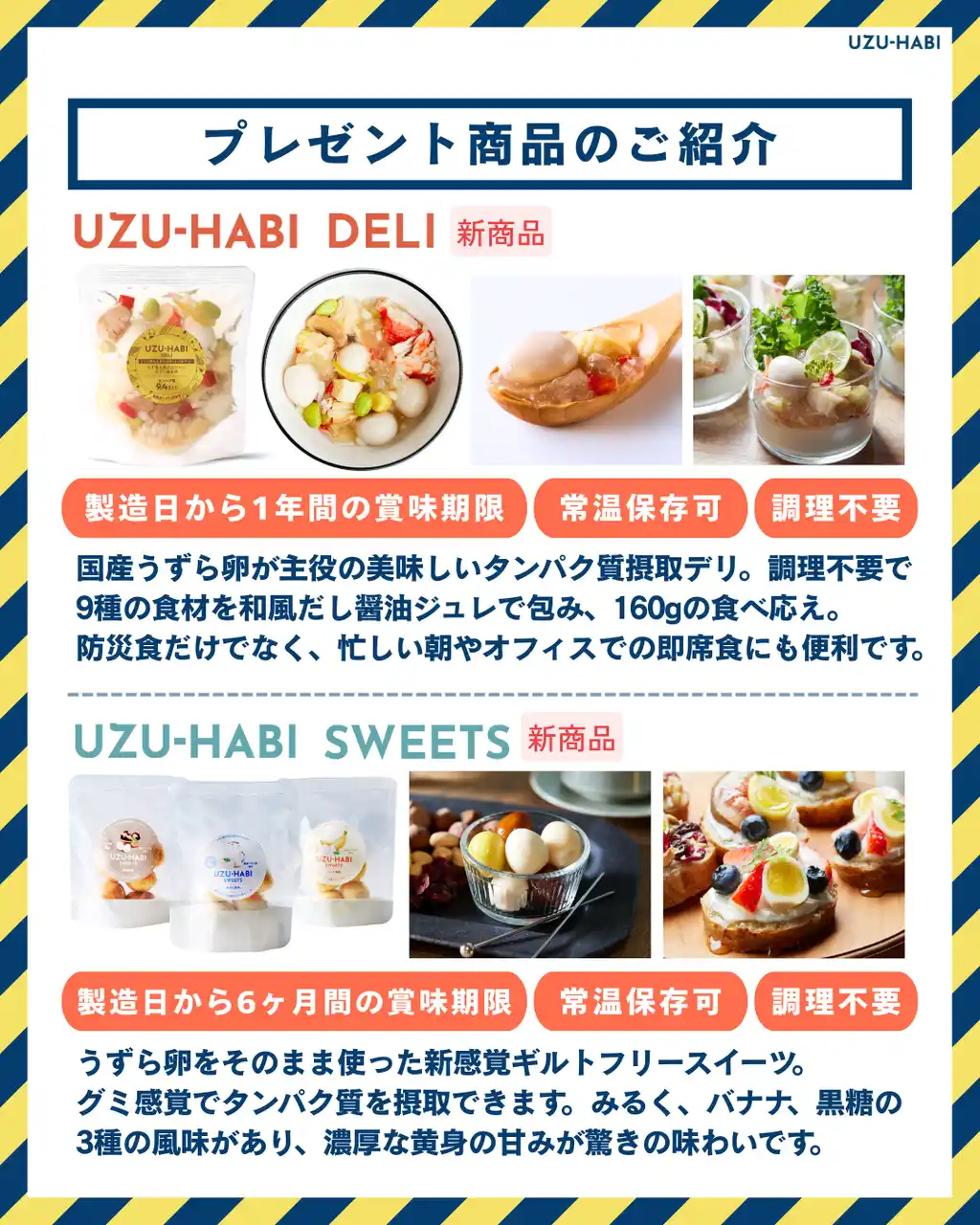 天狗缶詰は代表商品「こてんぐ おでん缶」を日常・防災食として提供してきました。さらに防災食備蓄促進のため、「うずら卵が主役のプロテイン UZU-HABI(ウズハビ)」を改良。UZU-HABI DELIの製造日からの賞味期限を4ヶ月間から1年間へ、SWEETSを4ヶ月間から6ヶ月間へ延長し、防災食ラインアップを拡充しました。 |