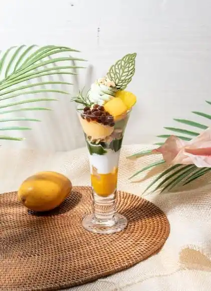 白玉のもちもちとした食感がトロピカルフルーツとココナッツミルクのまろやかさと好相性。和とアジアンのマッチングをお楽しみください。 |