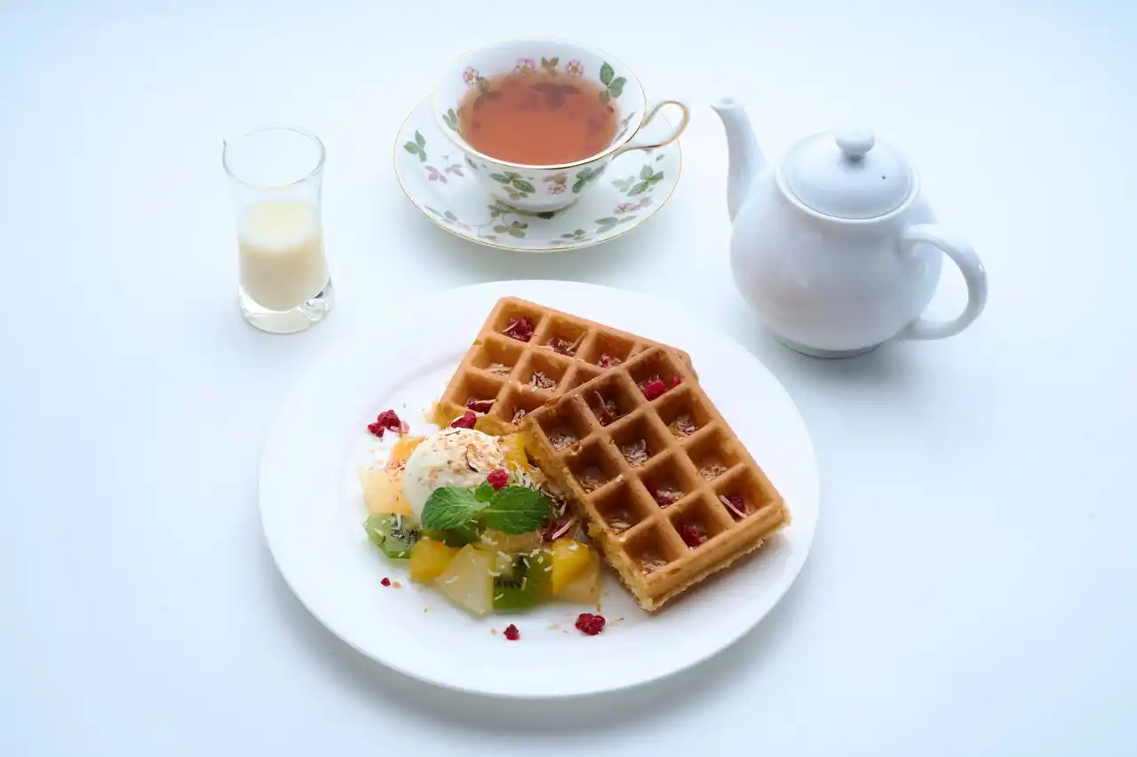 〈カフェ英國屋〉ココナッツワッフル単品 1,400円、ドリンクセット 1,950円/7階 |