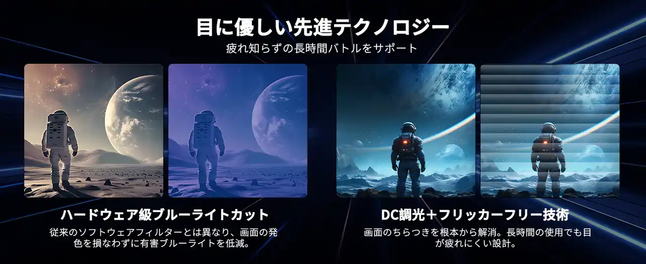 ハードウェアレベルでのブルーライト低減とフリッカーフリー(DC調光) を採用。長時間の作業やコンテンツ鑑賞でも目の疲れを軽減する。スタンドはチルト調整が可能で、VESAマウント(100x100mm)に対応し、ユーザーの好みに合わせた快適な視野角を容易に実現できる。 |