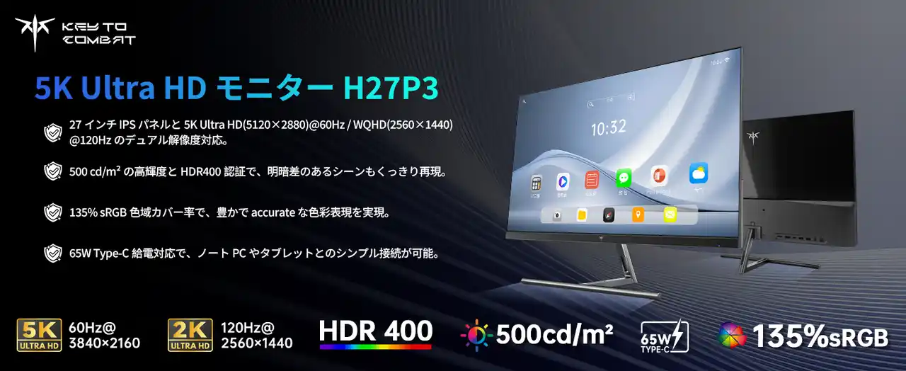 | ディスプレイメーカーの「KEY TO COMBAT」(略称:KTC) は本日、27インチ5K IPSモニター「H27P3」の販売を開始した。本製品は、AppleのStudio Displayに匹敵する色彩性能と精細な表示性能を、その半値以下という破格の価格で提供する。クリエイターやMacユーザーが求める高精度な色再現と、ゲームや動画編集にも対応した高リフレッシュレートの両立を実現した、ハイブリッドな性能が特徴だ。 | |||